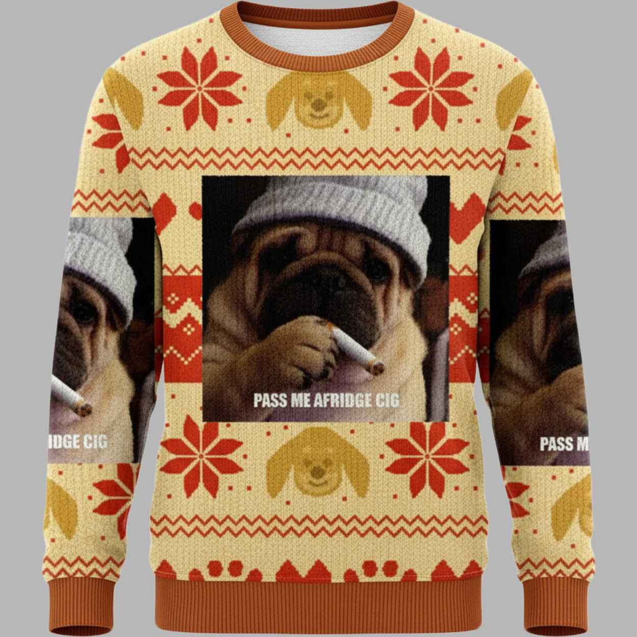 This eye-catching sweater features a warm, comforting beige and orange knit base, framed by classic, festive fair isle patterns incorporating snowflakes, hearts, and subtle dog motifs. The centerpiece is a large, square graphic featuring a serious, world-weary Shar Pei dog, wearing a beanie and holding a cigarette in its mouth (a stylized, humorous element). Below the dog, the iconic, meme-based text is clearly displayed: “PASS ME A FRIDGE CIG” (a reference to a term often used for a cigarette someone desperately needs). This design is a brilliant blend of internet culture, dark humor, and self-aware irony. It humorously captures the intense, slightly chaotic, and world-weary mood that often sets in during the holiday season, using the universally relatable image of a dog with deep, expressive wrinkles. Wearing this piece signals a sharp, witty, and bold personality, someone who embraces niche internet humor and finds comedy in the shared struggle of modern life. It’s the perfect, cozy way to make an instantly recognizable, funny, and deeply endearing statement to fellow meme enthusiasts.