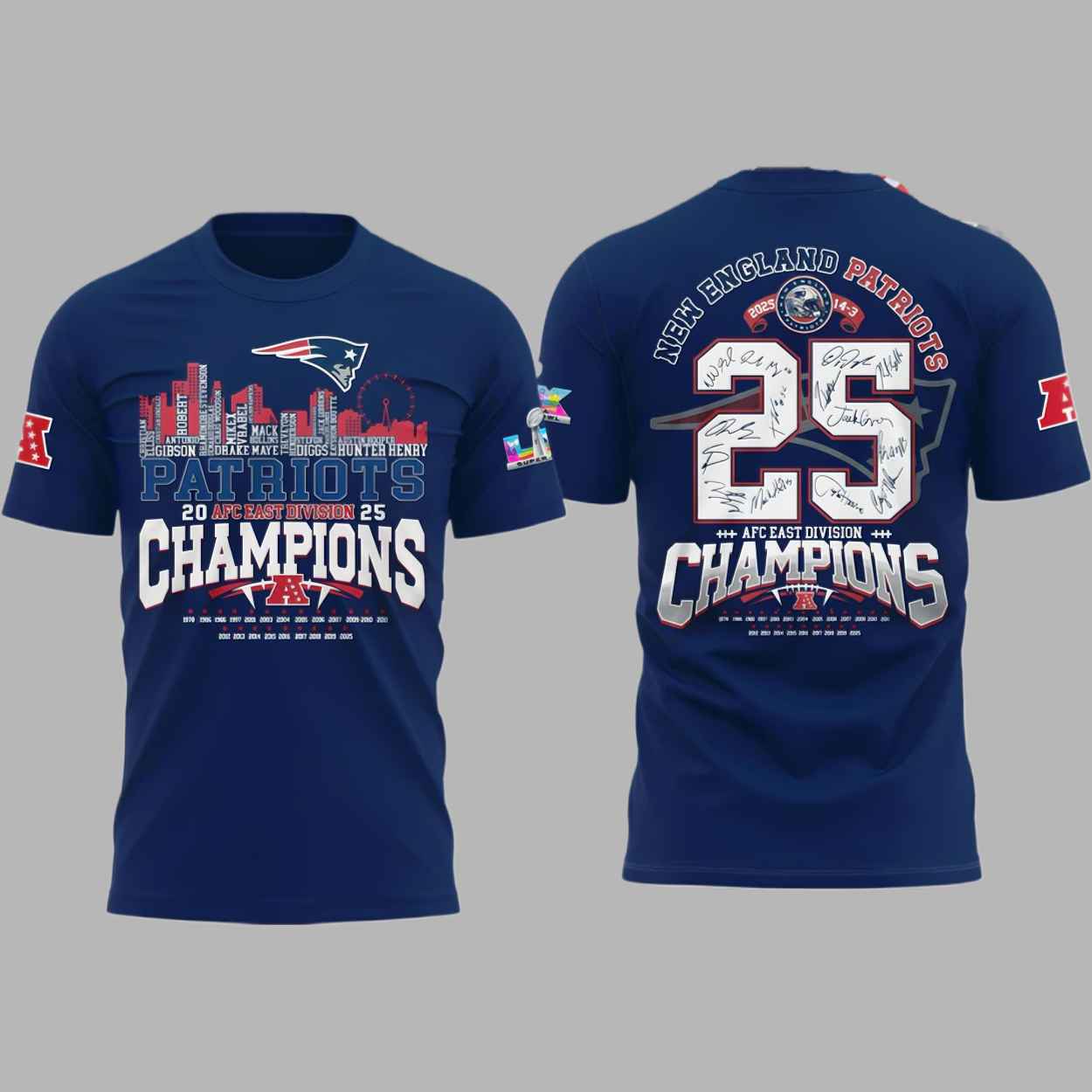 This shirt features a sophisticated design that serves as a wearable archive of a dominant 14-3 season and a hard-fought division title. The front displays a vibrant skyline graphic alongside the names of the key playmakers who defined the 2025 run, while the back prominently features a commemorative “25” design surrounded by the signatures of the roster. It captures the spirit of a team that defied the odds, representing the unity and relentless drive required to secure a spot on the world’s biggest stage in Super Bowl LIX.