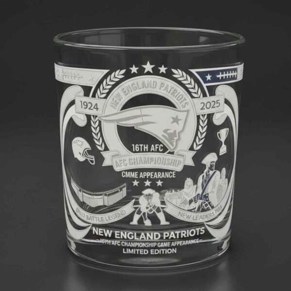 This barware piece features an intricate and high-impact frosted engraving that captures the spirit of a legendary football legacy from 1924 to 2025. The design is anchored by the central team emblem and a triumphant banner marking a historic 16th conference title game appearance, framed by a prestigious laurel wreath and commemorative stars. Detailed with iconic regional imagery—including the stadium silhouette, a focused athlete in action, and a classic revolutionary figure—this vessel serves as a functional trophy for the fans who have followed the squad’s rise to the top. It is a creative masterpiece designed for those who want to preserve the memories of a winning tradition while adding a touch of elegance to their home collection, making it a definitive symbol of loyalty and success.