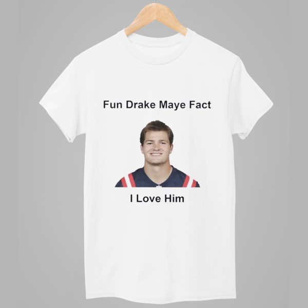This shirt embraces a minimalist, meme-style design to deliver a maximum impact of fan adoration. The clean, white background ensures the message and the player’s image stand out prominently. The shirt features a clear, centered photograph of the popular player, Drake Maye, smiling confidently in his uniform. Above the image, the text initiates the joke with the phrase “Fun Drake Maye Fact”. Below the photo, the simple, heartfelt punchline is delivered: “I Love Him”. The entire design is a witty, self-aware piece of modern fandom, mimicking the format of viral internet content. The shirt’s simplicity is its strength, turning a declaration of personal support into a universally recognized piece of fan humor. This shirt is far more than just apparel; it’s a playful, public declaration of confidence and emotional investment in the future of the team. It connects the wearer with the excitement and hope surrounding the player, making it a comfortable and immediate way to signal your enthusiastic backing and appreciation for his talent and potential.