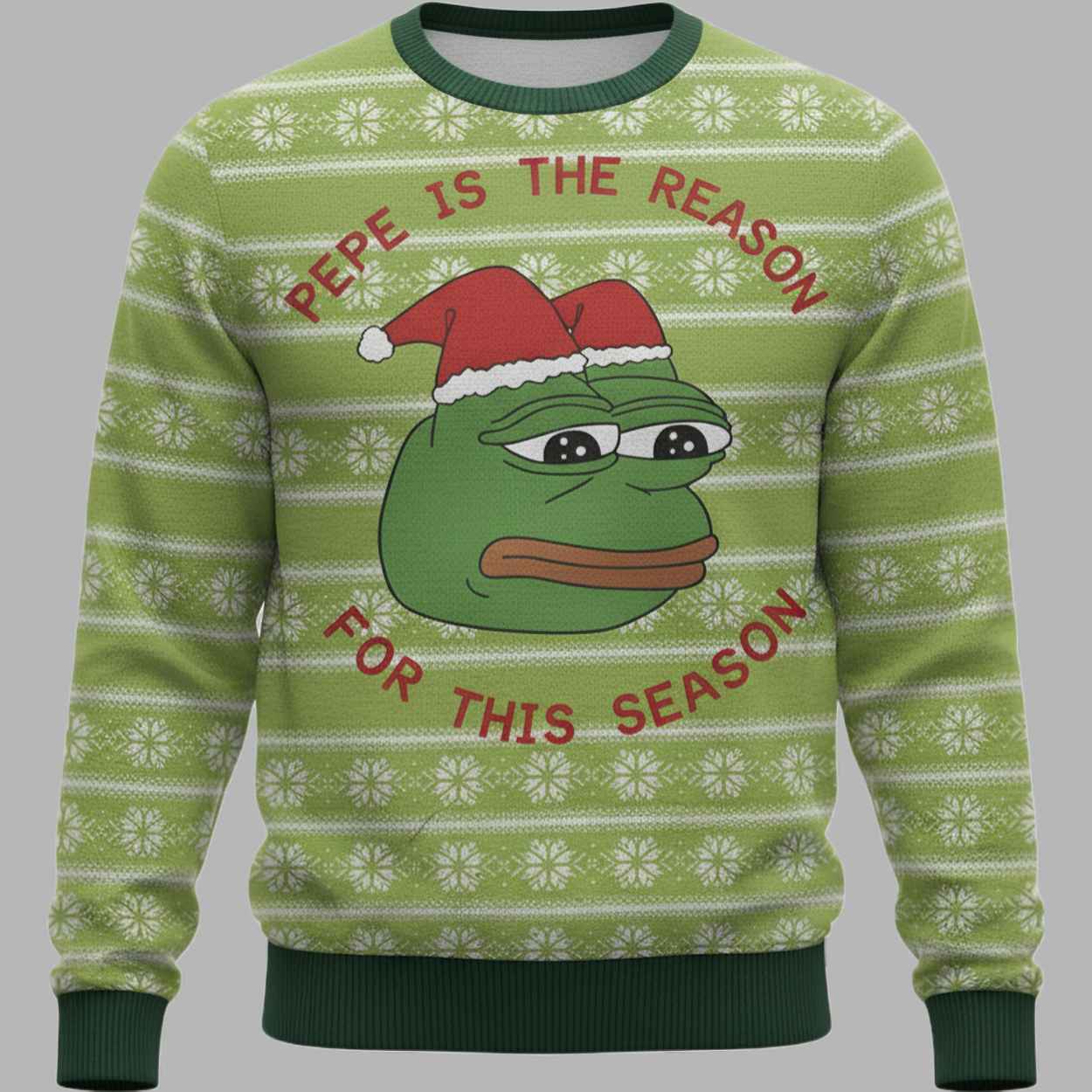 This uniquely styled sweater features a vibrant, festive green color palette interspersed with a classic, snowy knit pattern. The centerpiece is the iconic, sadly charming face of Pepe the Frog, solemnly donning a Santa hat. Encircling the beloved meme are the bold, ironic words: “PEPE IS THE REASON FOR THIS SEASON.” This design goes far beyond a simple novelty item; it’s a commentary on modern culture. Pepe the Frog, in this context, embodies the shared language, irony, and slightly melancholy humor of the internet generation. It signifies an appreciation for online subcultures and the way humor connects people across digital divides. Wearing this sweater is a non-verbal handshake with fellow internet denizens, a way of signaling that you understand the absurdity and profound connection found in the world of dank memes. It’s a playful and self-aware piece that challenges conventional holiday sentiment with a knowing wink, making it perfect for those who celebrate the holidays with a blend of tradition and digital-age irony.