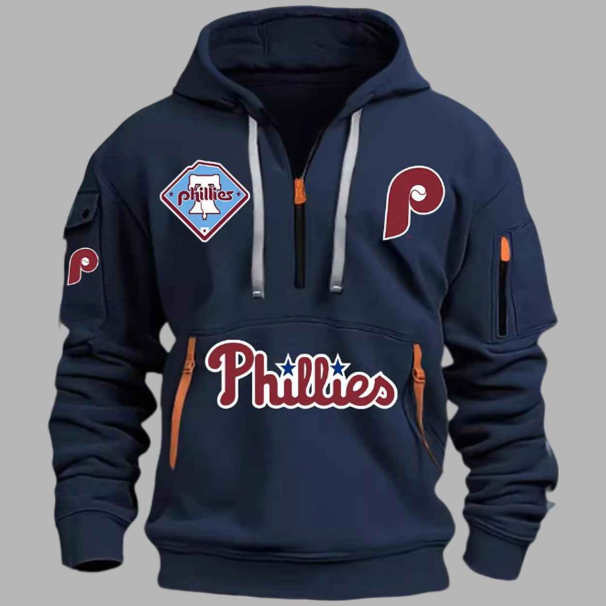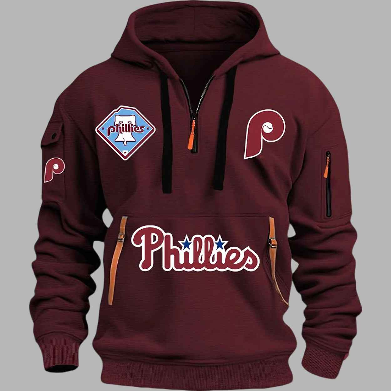- Pockets: A large front pouch pocket is accented by a prominent “Phillies” wordmark in script, complete with the star, and decorative brown/orange leather-look straps on the sides.