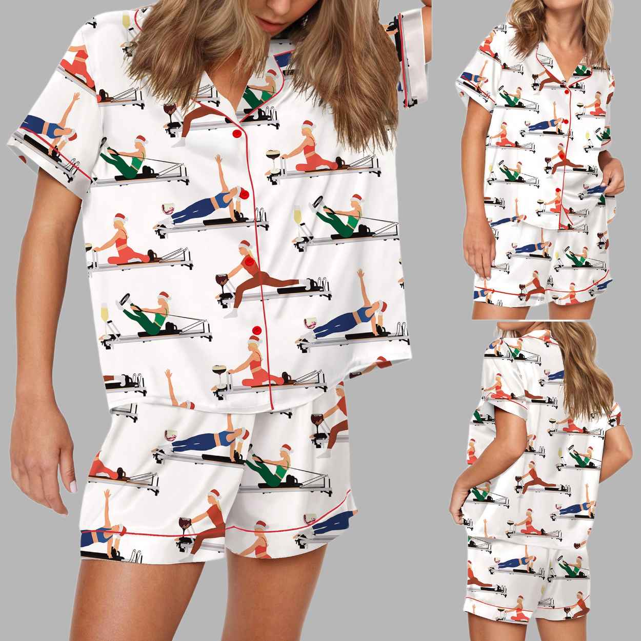 This charming pajama set features a crisp, elegant white background that provides the perfect canvas for its humorous and lively all-over print. The pattern showcases various female figures—the quintessential “Pilates Girl”—performing exercises on the Reformer machine. However, in a playful, holiday twist, each figure is also sporting a Santa hat and incorporating a glass of wine or a cocktail into her routine, sometimes balancing a glass, and sometimes sipping mid-stretch! The figures are rendered in bright, festive colors like red, green, and blue, making the pattern pop. The set includes a comfortable, short-sleeve button-down top and matching shorts, both trimmed with vibrant red piping along the edges, collar, and pockets, adding a refined, holiday-appropriate touch. The silky texture ensures a smooth, luxurious feel against the skin. This pajama set is much more than fun sleepwear; it’s a humorous and self-aware celebration of modern self-care, acknowledging that wellness often involves both dedication at the studio and happy hours with friends. It suggests that true balance means not taking yourself too seriously, especially during the holidays, and embracing both the burn of the workout and the reward of a well-earned drink.