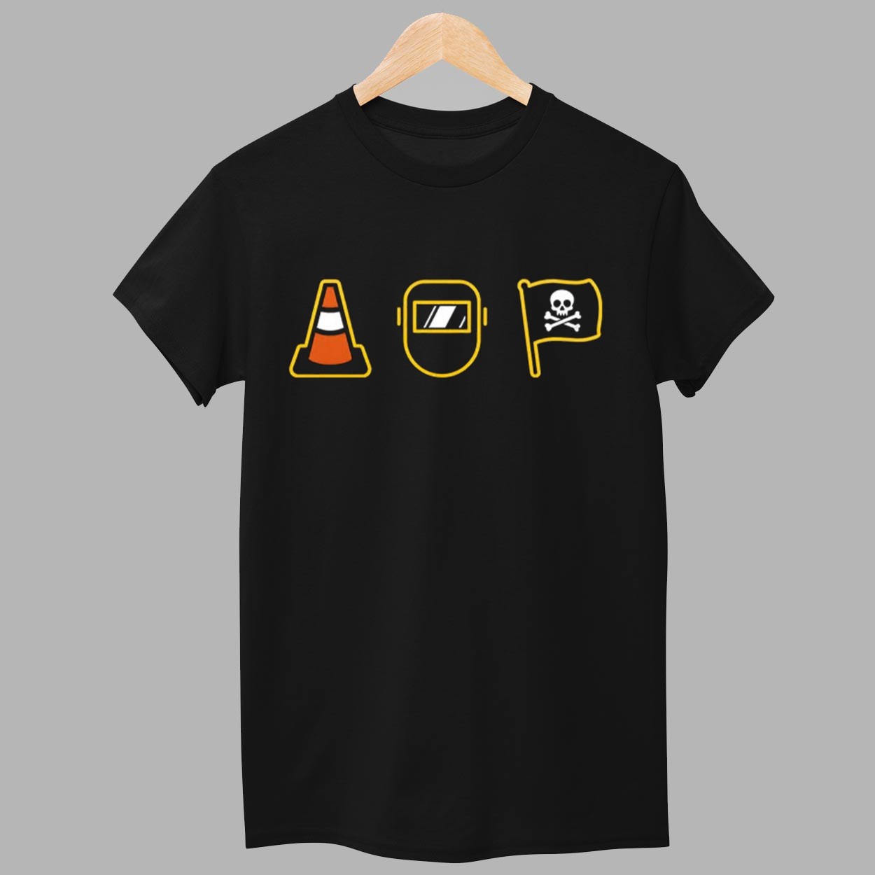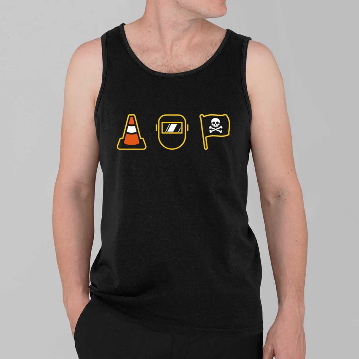 - Symbolic Iconography: Features a three-icon sequence: a bright orange traffic cone, a protective welder’s mask, and a classic pirate flag.