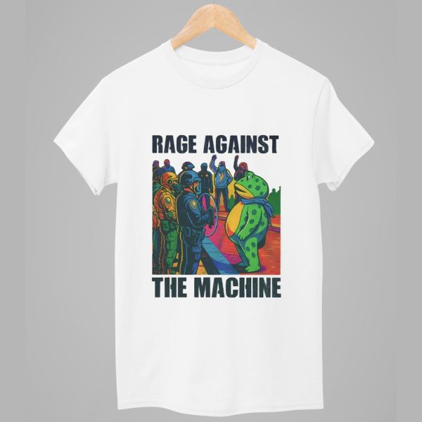 This white shirt features a striking, high-impact graphic that delivers an immediate and powerful message. The central image is rendered in a bold, comic-book-style, high-contrast palette, depicting a tense confrontation. In the foreground stands a large, determined frog, wearing a bandana and a defiant look, facing a group of figures in protective gear, symbolizing a stand against institutional power. Above and below this scene of resistance, the powerful, block-letter text delivers the unmistakable rallying cry: “RAGE AGAINST THE MACHINE.” The design’s intensity and clear visual narrative make it a powerful piece of wearable art. This garment is far more than just a piece of clothing; it is a declaration of personal ethics and a visual commitment to social advocacy. It embodies the spirit of local activism, the struggle for human rights, and the courage to peacefully stand up to overwhelming force. Wearing this shirt is a profound way to signal your solidarity, challenge the status quo, and celebrate the ongoing fight for justice.
