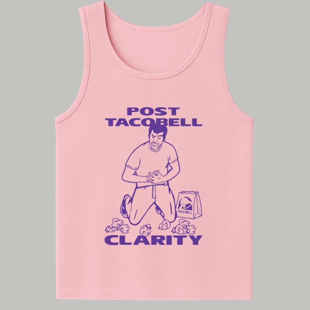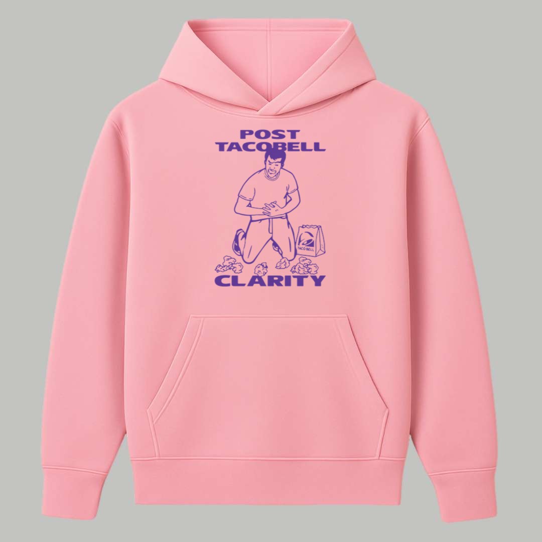 This exceptionally clever and humorous t-shirt is a spectacular piece of wearable comedy, designed for those who appreciate the cultural phenomenon of quick-service dining. The striking central graphic features a classic, stylized illustration of a person kneeling, clutching their stomach in a posture that is simultaneously pained and strangely contemplative. Scattered around them are crumpled wrappers and a distinct fast-food bag. Above and below this dramatic scene, the bold text delivers the perfect, ironic punchline: “POST TACOBELL CLARITY.” The simple two-color print—purple graphic on a soft pink tee—gives it a fun, retro, and slightly absurd aesthetic. This garment is far more than just casual apparel; it’s a brilliant, humorous symbol of impulsive choices, relatable regret, and the strange, profound wisdom that only emerges in the aftermath of a major snack decision. It’s an ideal way to showcase your witty, self-aware personality and inject some unforgettable, laugh-out-loud humor into any casual outing.