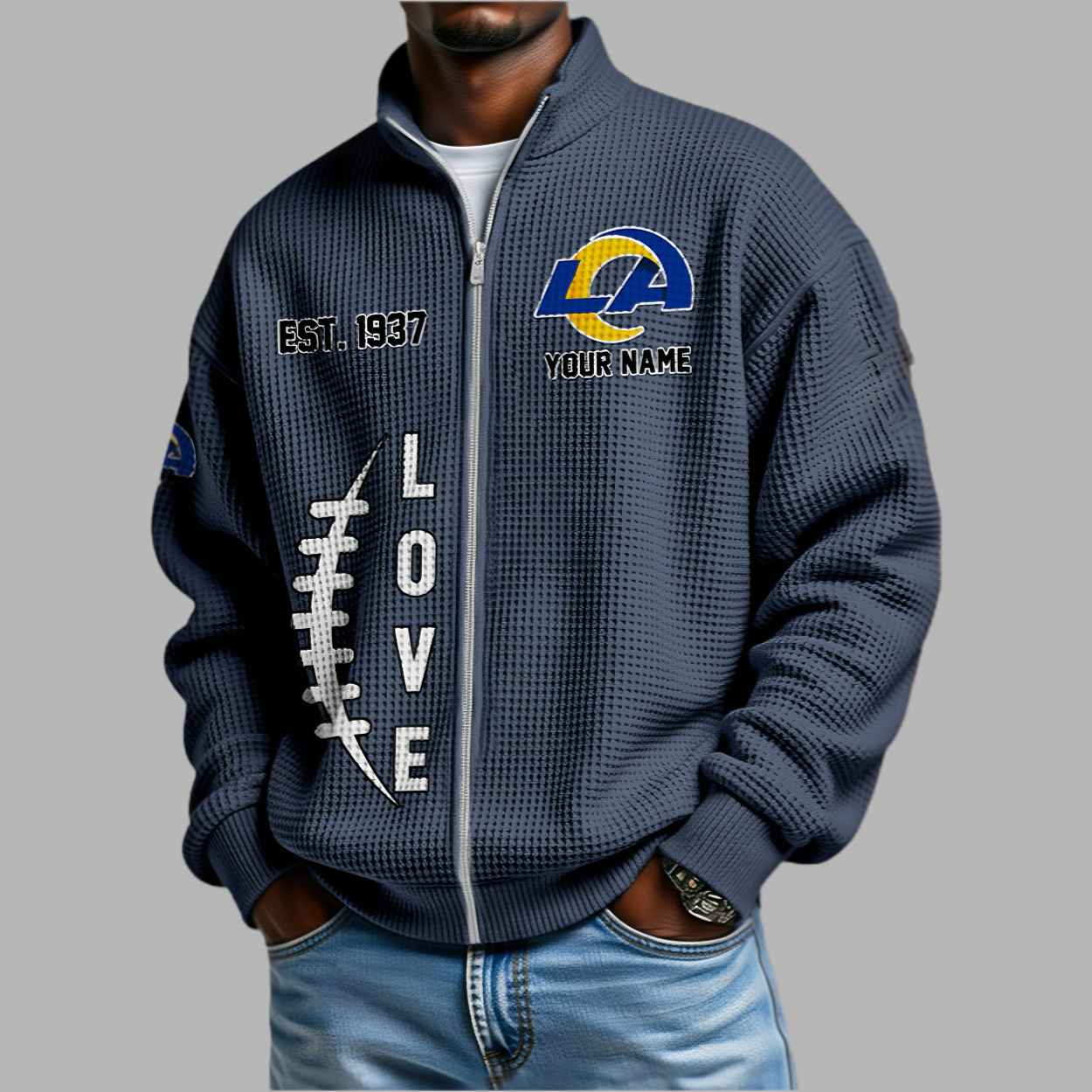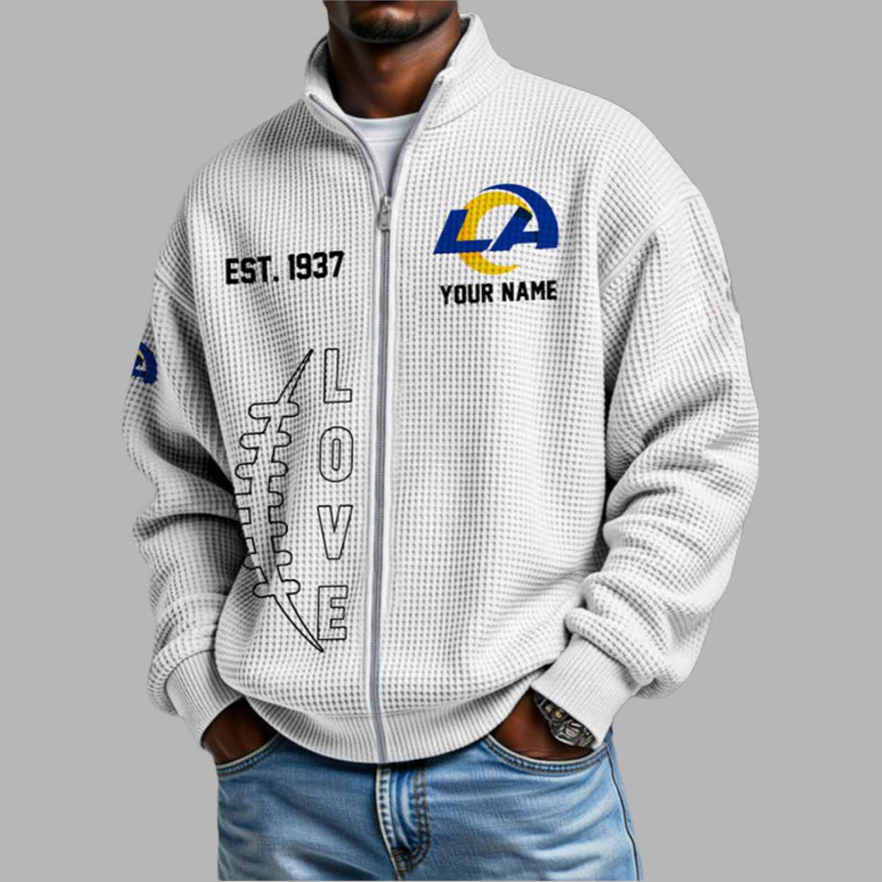 This sophisticated navy blue sweatshirt features a modern waffle-knit texture that brings a tactile, high-end feel to your daily wardrobe. The design is a heartfelt tribute to heritage, prominently displaying the iconic blue and gold “LA” emblem on the chest alongside “EST. 1937” to honor the franchise’s historic founding year. A unique vertical “LOVE” graphic, creatively detailed with football-style stitching, runs down the front, while the sleeve is finished with additional team logos for a complete, athletic look. Beyond its sharp aesthetic, this garment represents the unyielding spirit and strength of a community that has stood together through every victory since the team’s inaugural era. It is a creative masterpiece designed for those who value long-standing traditions and want to represent their lifelong passion with a sleek, professional silhouette that transitions perfectly from the stadium to your daily routine.