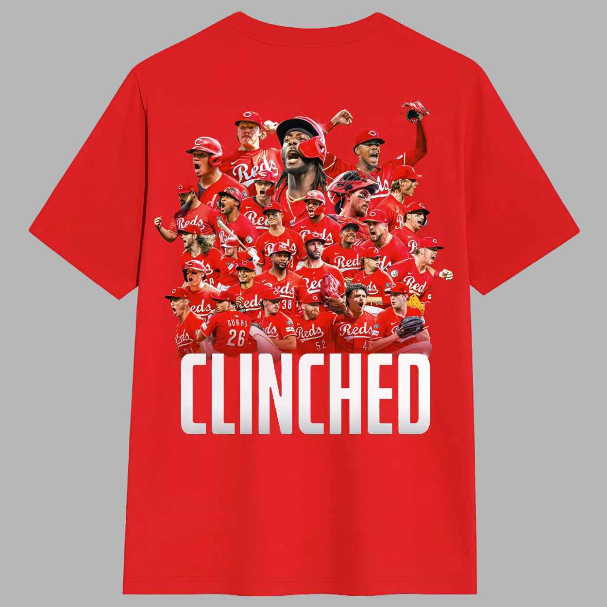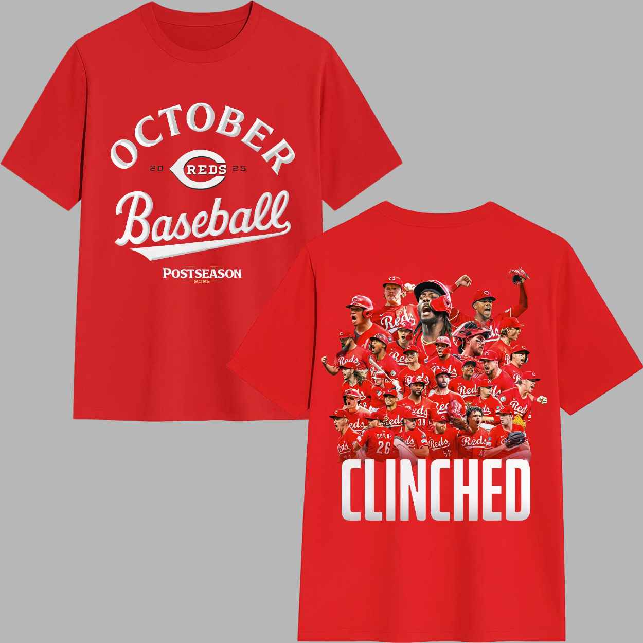 The Front proudly displays the text “OCTOBER Baseball” in a bold, stylized font, with the year “2025” positioned around the iconic Reds logo. This design is a pre-emptive celebration, a hopeful look into a postseason run that is on the horizon. The Back is where the real statement is made. A dynamic collage of key Reds players is featured, celebrating the camaraderie and talent of the team. The bold text “CLINCHED” is printed below the players, a powerful declaration of a playoff berth that has been secured. This shirt serves as a “pre-emptive strike” and a symbol of unwavering faith in the Reds’ ability to make a deep run in the 2025 MLB playoffs. It commemorates the hope for a championship, celebrating the team’s consistent performance and the incredible optimism of its devoted fan base.