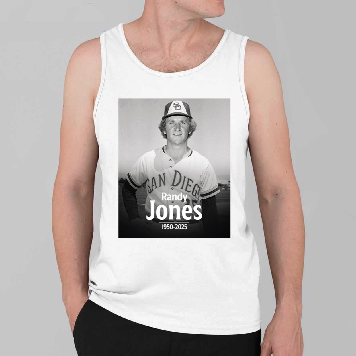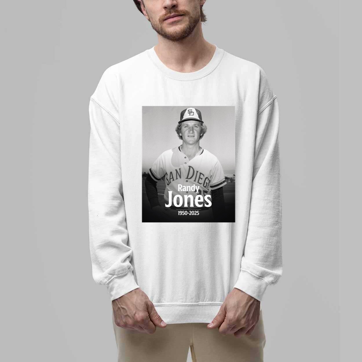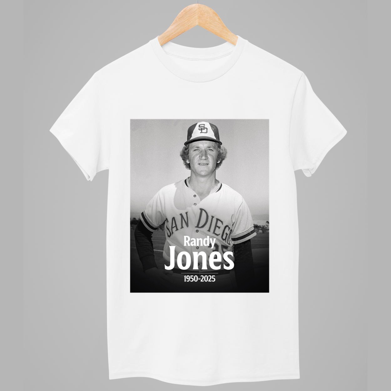 This classic, clean white shirt provides a dignified canvas for a powerful memorial image. The centerpiece is a prominent black and white portrait of Randy Jones in his playing days, wearing his team uniform and cap. Below the photo, the words “Randy Jones” are displayed prominently, along with the years of his life, “1950-2025.” This shirt is much more than fan apparel; it is a heartfelt symbol of enduring respect and shared memory. Its meaning lies in its ability to connect generations of fans who witnessed his contributions and those who admire his legacy. Wearing this shirt signifies that the memories and achievements of a true sporting icon will never be forgotten, serving as a quiet, respectful acknowledgment of his impact on the team, the sport, and the community. It’s a tangible way to mourn a loss while simultaneously celebrating a life well-played and a career well-loved.