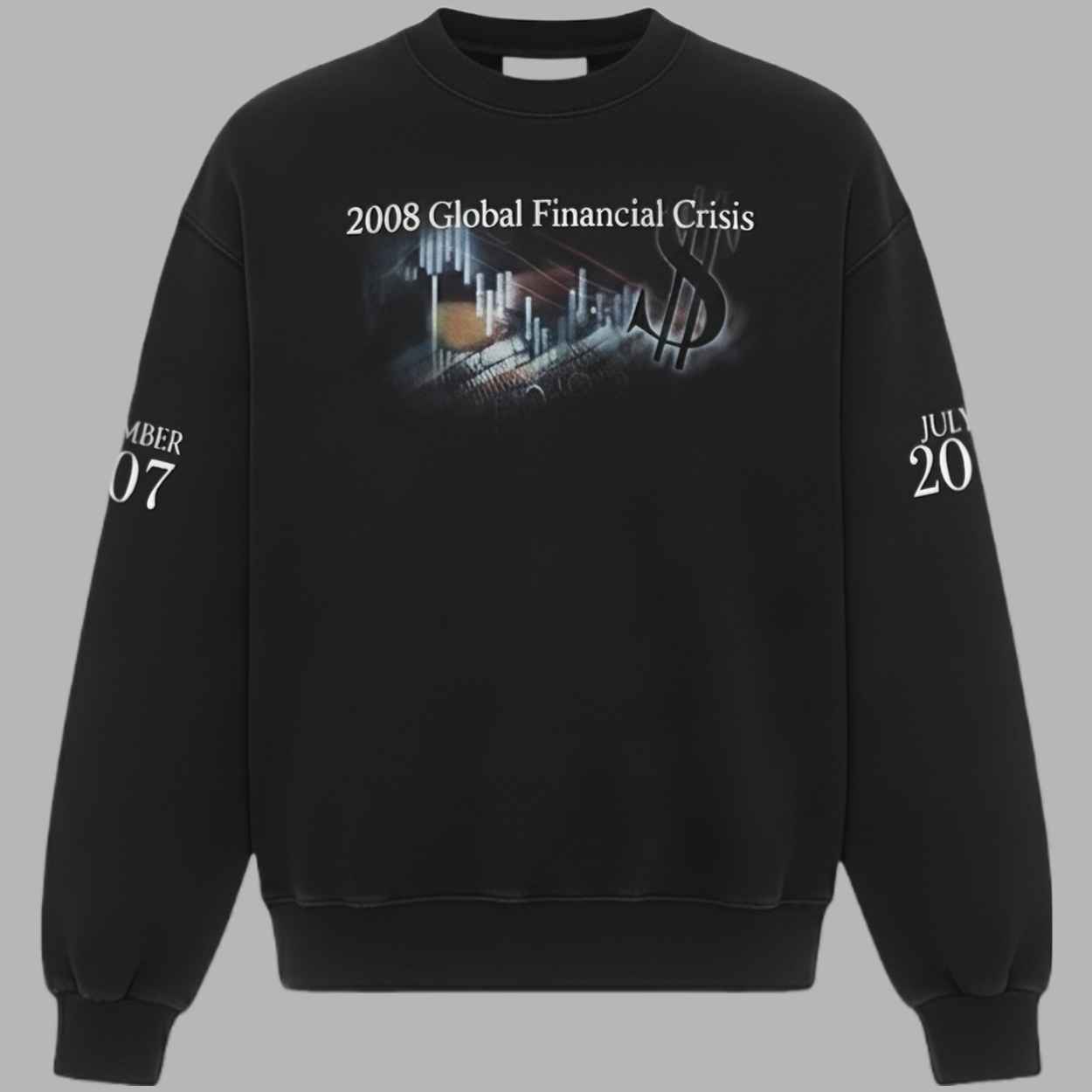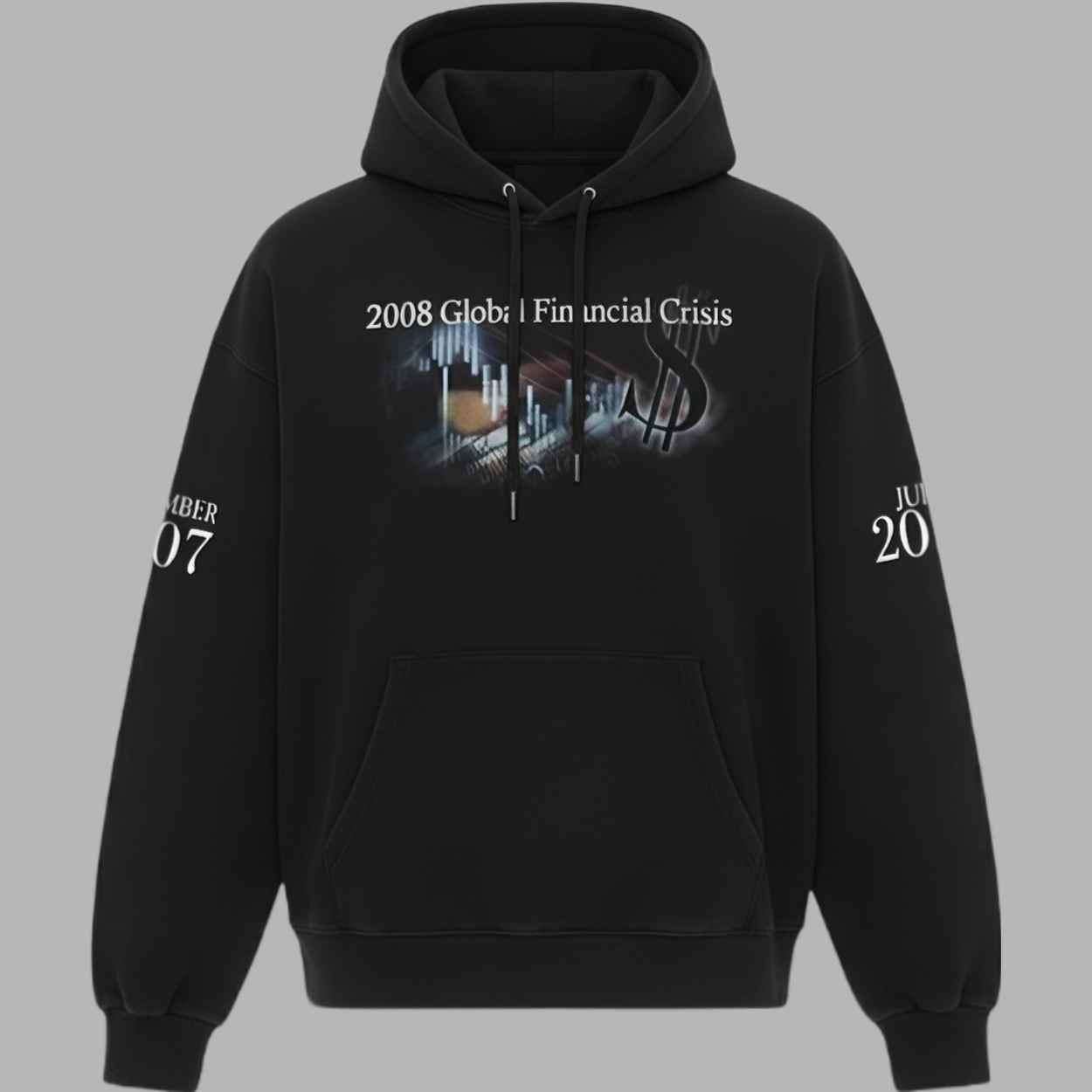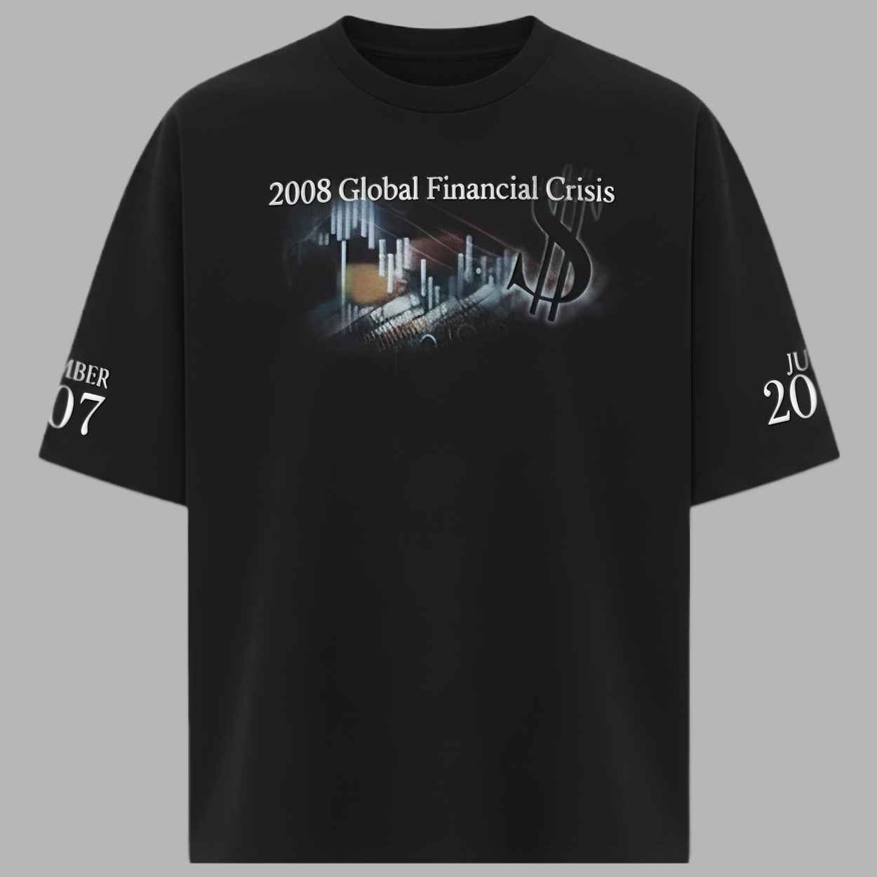 This classic black shirt provides a powerful, somber canvas for its theme. The upper chest features the clear, stark text: “2008 Global Financial Crisis.” Below this text, a dynamic, smoky graphic illustrates the chaos and turmoil of the economic collapse—featuring falling stock market graphs, blurred cityscapes representing financial centers, and a large, ominous dollar sign symbolizing the crisis at hand. The shirt also features dates printed on the sleeves, lending it an archival, time-stamped feel. The meaning of this shirt transcends mere fashion; it serves as a powerful reminder of economic fragility, resilience, and the historical events that define a contemporary generation. It’s a wearable artifact that acknowledges the challenging lessons learned during that period and honors the subsequent rebound. Wearing this piece signals a thoughtful, historically aware personality, someone who understands the weight of global events and chooses to express that awareness through bold, minimalist design. It encourages reflection on the past while looking forward to a more stable future.