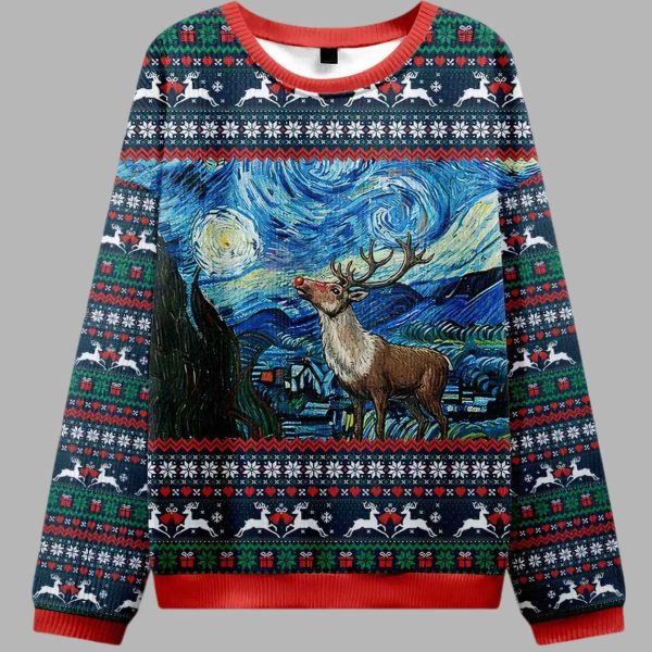 Rudolph Under The Starry Night Christmas Ugly Sweater: Masterpiece Meets Holiday Magic
