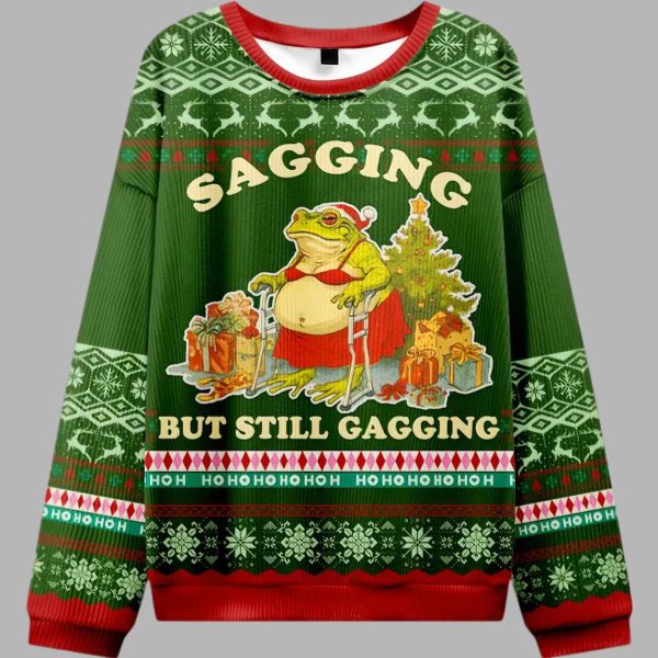 This bold green sweater features traditional ‘ugly sweater’ patterns in red, white, and dark green, including reindeer and snowflakes. The central, eye-popping graphic depicts a large frog dressed in a red Santa-style mini-dress and hat, sitting on a walker, surrounded by gifts and a tiny Christmas tree. Above and below the amphibian, the bold, humorous text reads: “SAGGING BUT STILL GAGGING.” The design wittily subverts the innocent imagery of Christmas, injecting it with crude, self-aware, and highly memorable humor about age, confidence, and enduring party spirit. This garment transcends standard novelty wear by providing a hilarious, adult commentary on life, aging, and the importance of maintaining one’s cheeky attitude. It transforms a simple piece of apparel into a loud, proud, and completely unforgettable statement perfect for adult-only gatherings.