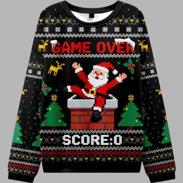 This spectacularly unique sweater is a phenomenal, witty addition to the ugly Christmas sweater canon, designed specifically for gamers and anyone who appreciates a funny, pixelated twist on holiday tradition. The captivating center graphic features a highly dramatic, pixelated Santa Claus comically stuck halfway down a chimney, arms and legs flailing. Above this festive failure, the bold, retro-style text declares: “GAME OVER,” and below, the punchline is delivered with a perfect gamer touch: “SCORE: 0.” The scene is flanked by pixel Christmas trees and reindeer, all rendered in an 8-bit aesthetic. The entire dynamic scene is set against a dark black, ribbed background and is framed by traditional fair isle-inspired borders featuring repeating motifs of snowmen, reindeer, and geometric patterns in classic red, white, and green. This garment is far more than just holiday apparel; it’s a brilliant, humorous symbol of relatable holiday failures, the challenges of ambitious tasks, and the joy of embracing one’s inner nerd during the festive season. It’s an ideal way to showcase your witty, unique personality and inject some unforgettable, laugh-out-loud charm into any Christmas gathering.