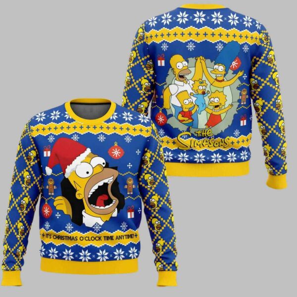 This festive knit sweater features a hilarious image of Homer Simpson dressed as Santa Claus, complete with a Santa hat and a mischievous grin. The design is set against a vibrant blue background with festive yellow snowflakes and a classic “The Simpsons” logo. The front of the sweater showcases a close-up of Santa Homer with his iconic catchphrase “It’s Christmas O’Clock Anytime!” while the back features the entire Simpsons family gathered around the Christmas tree.