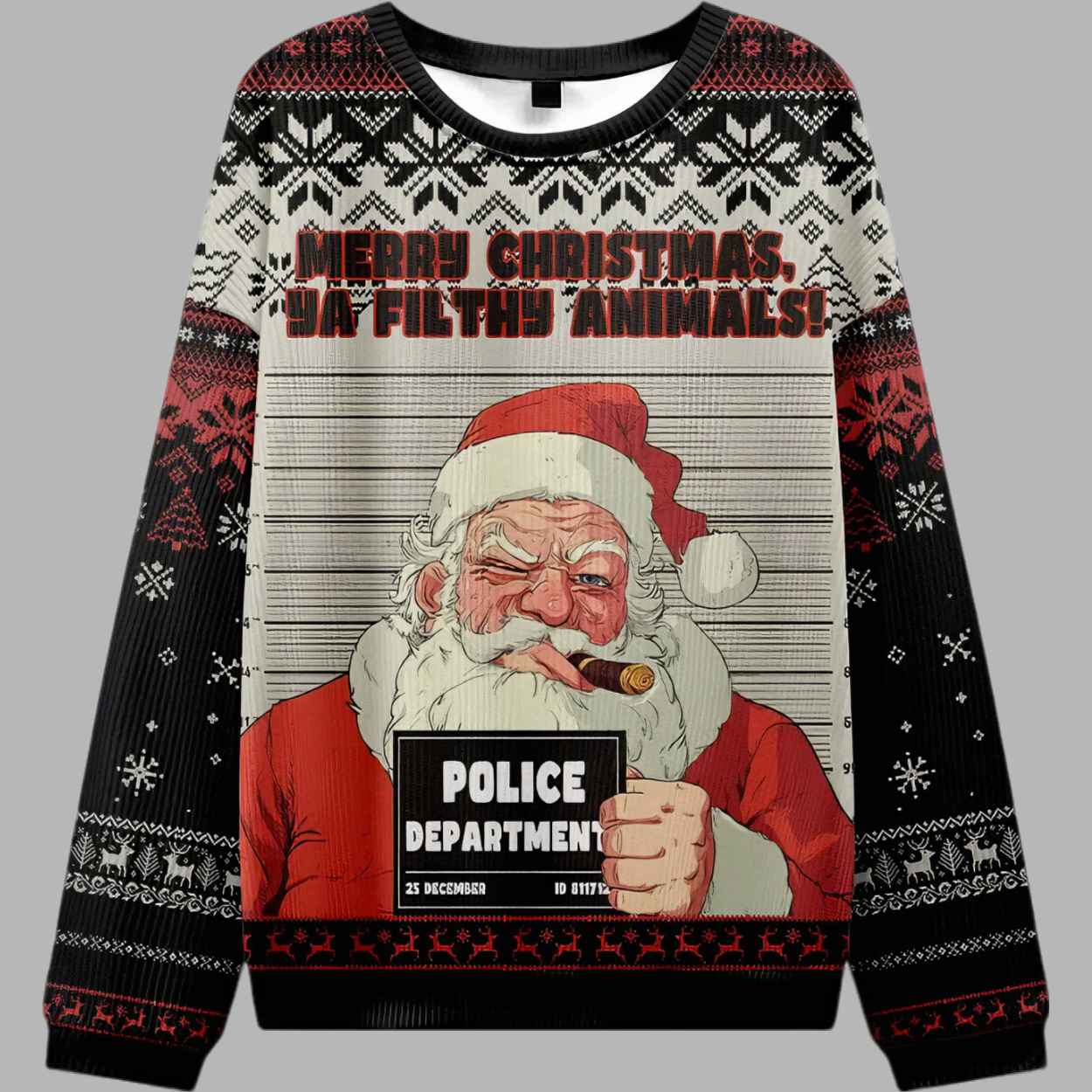 The central graphic is the core of the joke: a large, detailed illustration of Santa Claus is depicted in a police mugshot. Santa, looking thoroughly unrepentant, is wearing his classic red suit and hat, but he’s winking, smoking a cigar, and holding a police identification board that lists the date as “25 DECEMBER.” Above the defiant Santa is the iconic movie line, printed in bold, distressed white font: “MERRY CHRISTMAS, YA FILTHY ANIMALS!” The image brilliantly subverts the wholesome Santa image, portraying him as a legendary, rebellious figure finally caught by the law.