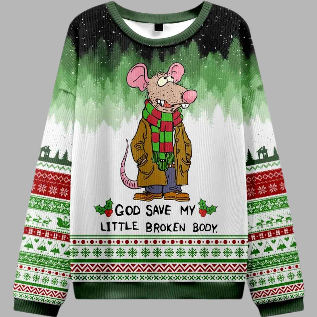 This striking sweater features a blend of white and green, with a fading, wintry forest motif at the top. The hem and sleeves are bordered with dense, traditional ‘ugly sweater’ patterns in red and green, including snowflakes, reindeer, and pine trees, creating a cozy festive frame. The centerpiece is a detailed, recognizable cartoon rat character, dressed in a long, tattered coat and a mismatched Christmas scarf, looking both exhausted and slightly manic. Beneath the character is the relatable, comical text: “GOD SAVE MY LITTLE BROKEN BODY.” The design wittily juxtaposes the cheer of Christmas with the weary, often over-stressed reality of the season. This garment transcends typical novelty wear by tapping into a shared sense of nostalgia for a character known for enduring hardship, transforming the internal feeling of holiday exhaustion into a funny, external declaration of survival.