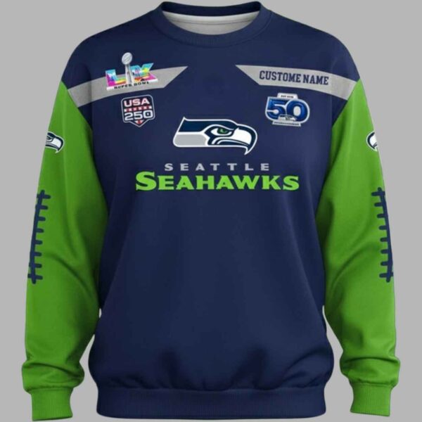 This long sleeve shirt features a sophisticated navy and action green design that intricately weaves together the franchise’s historic past and its bright future. The front is anchored by the iconic hawk head logo and bold “SEATTLE SEAHAWKS” typography, flanked by prestigious commemorative insignias including the Super Bowl LX logo and a specialized “50” anniversary shield. It serves as a wearable timeline of elite sportsmanship, representing fifty years of grit and the unwavering pursuit of global glory on the world’s biggest stage.