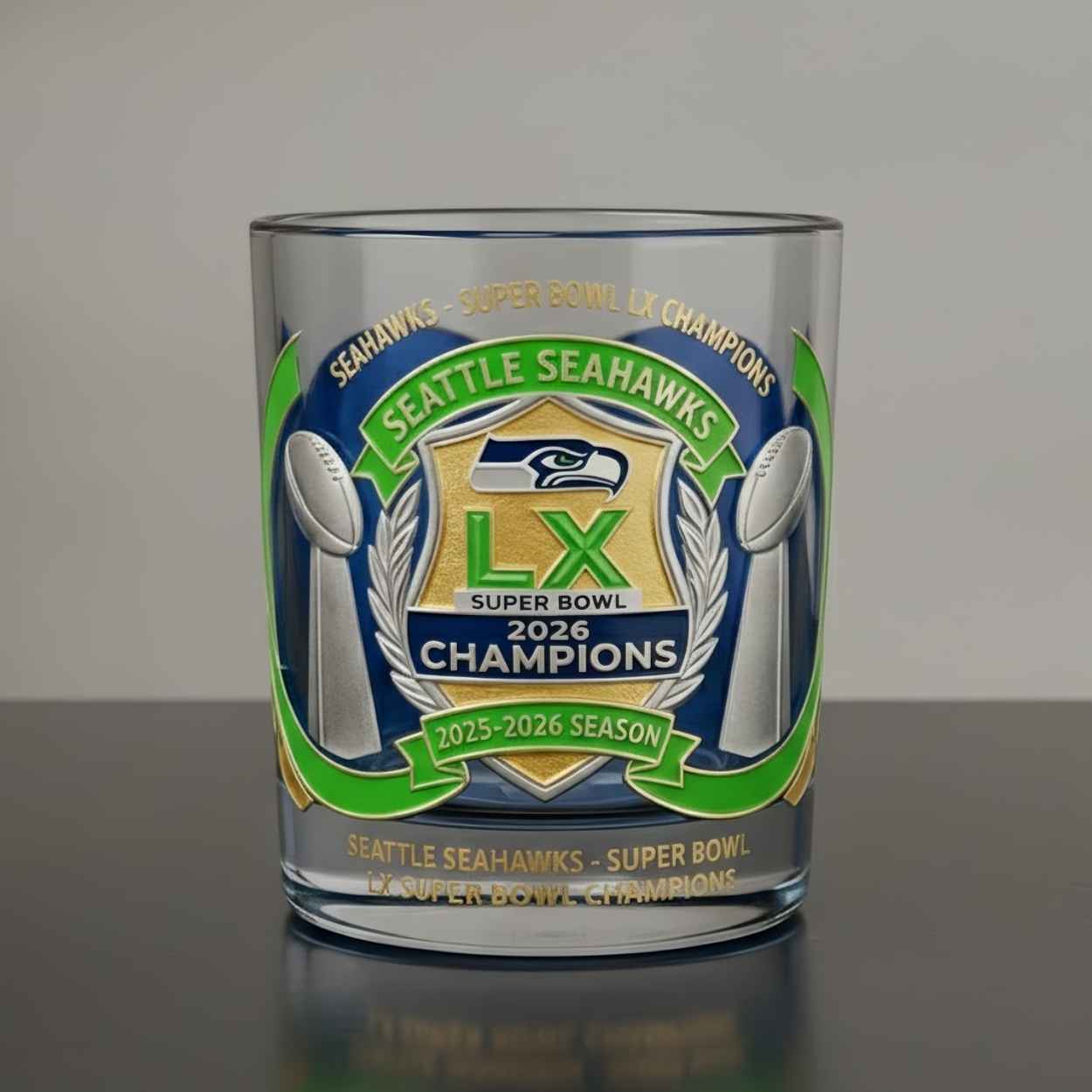 The Seahawks Bowl LX Champions Commemorative Glass features a sophisticated design centered by a golden shield emblazoned with the iconic team hawk and a bold “LX” insignia. Flanking the central crest are two silver championship trophies, symbolizing the dual strength of the offense and defense that propelled the team to the top of the 2025-2026 season. Wrapped in a vibrant action green ribbon that proudly proclaims “Seattle Seahawks Champions,” the artwork serves as a permanent tribute to the unity of the fans and the relentless spirit of a team that made history. Every detail, from the specialized “Super Bowl 2026” text to the elegant gold-and-navy accents, is crafted to represent a legacy of excellence and the unforgettable memories of a historic winning campaign.
