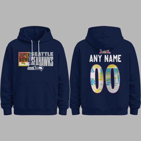 This hoodie features a sleek navy blue design that captures the prestige and excitement of the milestone 2026 championship event in the San Francisco Bay Area. The front is anchored by the iconic hawk head logo alongside a vibrant “SUPER BOWL LX” graphic, while the back offers a personalized touch with a customizable nameplate and large, city-skyline patterned numbers. It serves as a wearable trophy, representing the grit and unity of a franchise that has reclaimed its position at the summit of the conference, providing a professional and spirited way to honor the team’s pursuit of global glory.