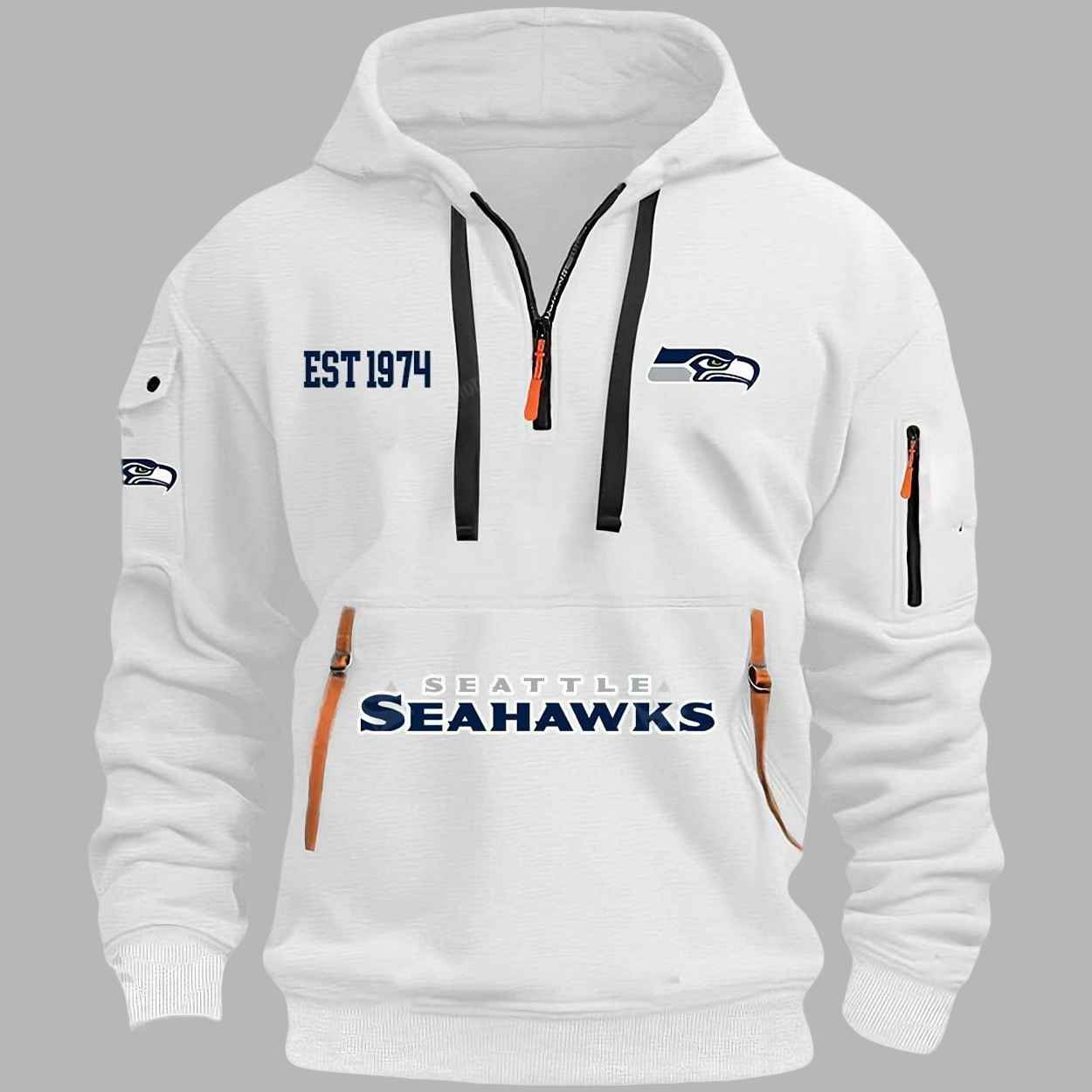 This sleek white hoodie features a modern, quarter-zip design with a unique twist. The front pocket has a large “SEAHAWKS” logo in a vibrant navy blue font. The right sleeve has a small zip pocket, perfect for storing essentials, and a classic Seahawks logo patch. On the left side, the words “EST 1974” are printed in a clean, orange font, a nod to the team’s founding year. The chest has a quarter-zip closure with a long, contrasting black cord. The hood has a cozy fleece lining, and the hoodie is made from a soft, quality fabric that’s perfect for a chilly day.