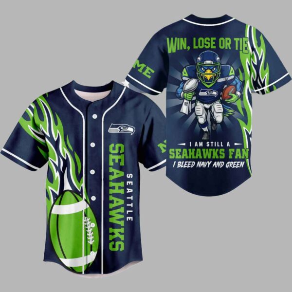 This button-up baseball-style jersey features a dynamic and fierce design that captures the relentless spirit of the Pacific Northwest. The front is dominated by a vertical team wordmark and a large action-green football, while the back showcases a powerful mascot character charging forward under the rally cry “WIN, LOSE OR TIE, I AM STILL A SEAHAWKS FAN.” Beyond its bold aesthetic, this garment represents the “12th Man” pride and the unbreakable bond shared by a community that supports their team through every high and low. It is a creative masterpiece designed for those who want to carry the energy of the stadium and a piece of historic team culture wherever they go, making it a definitive symbol of passion for every true supporter.