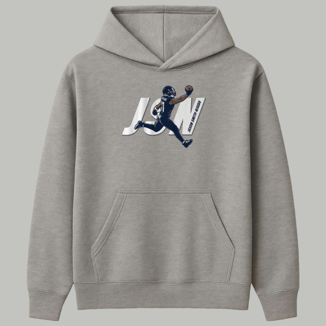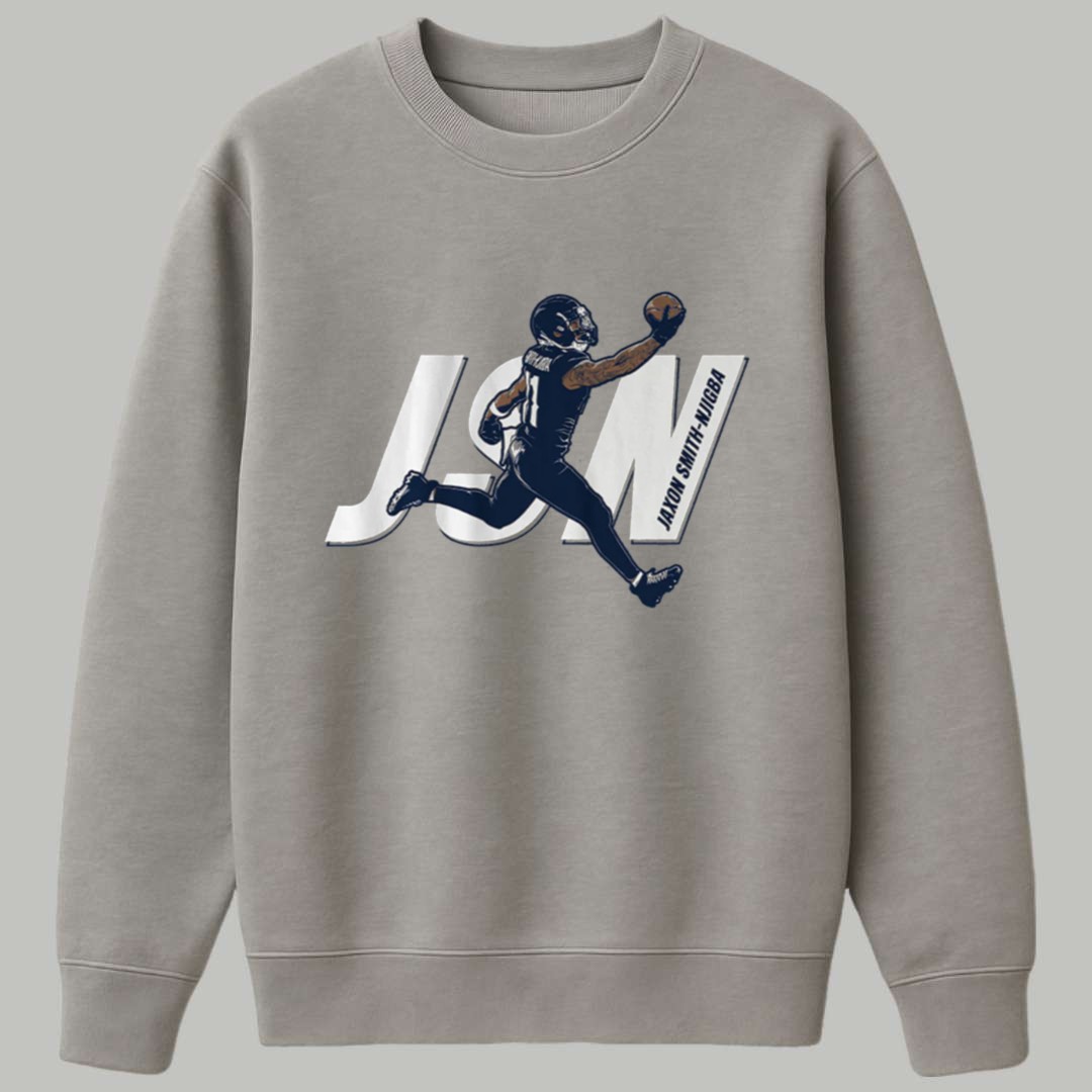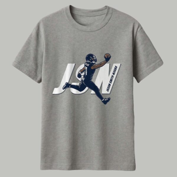 This shirt features a sleek and modern graphic of Jaxon Smith-Njigba in action, capturing his incredible athleticism and concentration as he makes a leaping catch. The design is anchored by the bold “JSN” initials and his full name in a sharp, athletic font that perfectly complements the team’s aesthetic. It serves as a wearable tribute to one of the most exciting young stars in the league, representing the skill and agility that have made him a cornerstone of the team’s aerial attack and a fan favorite in the Pacific Northwest.