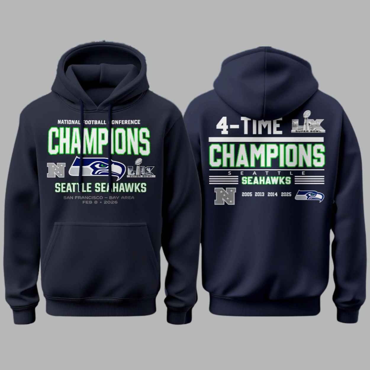 This shirt features a bold, high-impact design that honors the team’s status as 4-time conference winners. The front showcases a vibrant “Champions” graphic in action green alongside the iconic team logo and Super Bowl LIX detailing, while the back prominently displays the championship years—2005, 2013, 2014, and the historic 2025 victory. It serves as a wearable archive of excellence, capturing the grit and relentless spirit of a franchise that continues to define what it means to rule the conference.