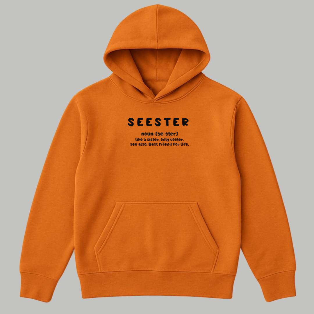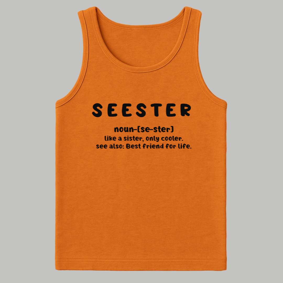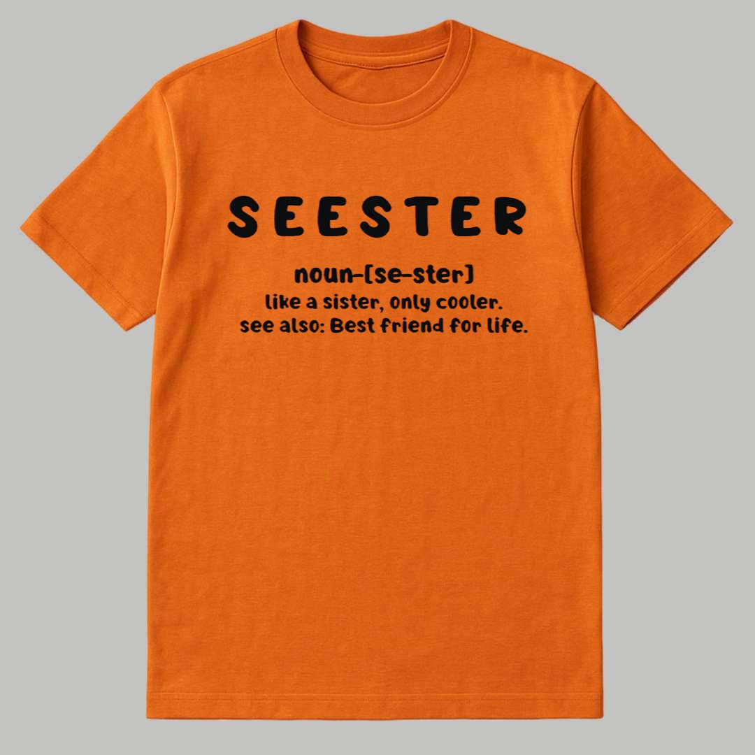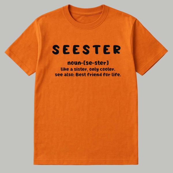 This vibrant orange T-shirt features a fun, dictionary-style definition that humorously and affectionately defines a “SEESTER” as “like a sister, only cooler” and “Best friend for life.” This apparel is a charming tribute to the unbreakable, chosen connection between best friends or close relatives, encapsulating the deep love, loyalty, and fun shared in that relationship. It’s a sweet, personal, and witty way to acknowledge someone who holds a foundational, irreplaceable role in your life, making it a perfect symbol of lasting friendship and camaraderie.