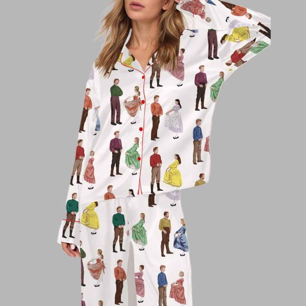 This exquisite pajama set captures the vibrant energy and charm of the beloved classic film, Seven Brides for Seven Brothers, in a delightful, all-over print. The smooth, elegant white satin fabric serves as a clean canvas for a colorful, repeated pattern featuring the film’s characters. The print showcases the seven Pontipee brothers and their beautiful brides, all rendered in their distinctive, colorful frontier and period-style attire (greens, yellows, pinks, and browns). The figures are captured in various poses, some standing resolutely and others mid-dance, creating a lively, rhythmic feel across the fabric. The overall effect is one of continuous, lighthearted movement and celebration. The set includes a long-sleeved button-down top and matching long pants, both detailed with a vibrant red piping along the collar, placket, and cuffs. This red trim adds a traditional, contrasting pop of color and a refined finish. The silky texture ensures a smooth, flowing fit, perfect for lounging or drifting off to sleep. This set is far more than just comfortable sleepwear; it’s a wearable celebration of the film’s themes of family, courtship, and the transformative power of love. It embodies the high-energy choreography, the heartwarming story, and the colorful aesthetic of the classic musical, making it a comfortable, beautiful symbol of enduring romance and cinematic joy.
