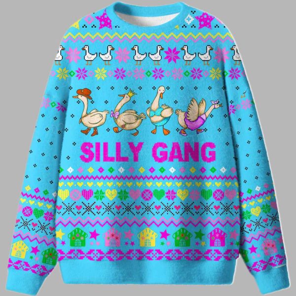 This spectacular sweater features a high-energy, unforgettable color palette, dominated by a vibrant sky blue base that beautifully sets off the electric pink, lime green, and bright yellow accents. The central graphic is a hilarious, charming image of four geese, each one dressed in a quirky, fun outfit: one in a cowboy hat, another wearing a tiny crown, another in a tank top, and the last with a ribbon in her hair. Below this comical line-up, the text boldly declares the mood: “SILLY GANG”. The entire design cleverly blends this modern, meme-worthy theme with a maximalist approach to “ugly Christmas sweater” patterns. The sweater is framed by intricate borders of pixelated ducks, tiny stars, hearts, geometric zigzags, and rows of colorful, folk-art-style houses, all mixed together in a delightful clash of motifs. The bright, chaotic colors and patterns turn a simple garment into a wearable party. This sweater is far more than just a funny piece of clothing; it’s a confident, hilarious celebration of friendship, individuality, and the joy of being unapologetically silly together. It transforms the holiday season into a time for playful anarchy and self-expression, suggesting that the best way to enjoy the holidays is to gather your favorite people and embrace the wonderfully weird, making it a comfortable and immediate symbol of collective, high-energy fun.