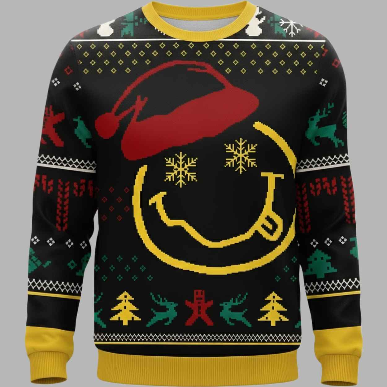 This bold black sweater features traditional ‘ugly sweater’ knit patterns in festive red, green, and white, including pixelated reindeer, Christmas trees, and snowflakes. The central, unmistakable image is a large, yellow, slightly distorted smiley face, updated for the holidays with a red Santa hat and snowflakes covering its eyes. The iconic, somewhat manic grin remains, now suggesting a state of holiday overstimulation rather than simple joy. The yellow cuffs and collar trim enhance the vibrant, rebellious color scheme. This garment transcends typical festive wear by merging the counter-cultural aesthetic of the late 20th century with cozy Christmas kitsch. It symbolizes the chaotic, tongue-in-cheek side of holiday celebrations, offering a humorous, knowing nod to those who find the official festive cheer overwhelming or darkly funny.