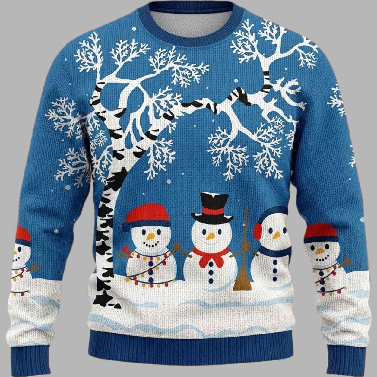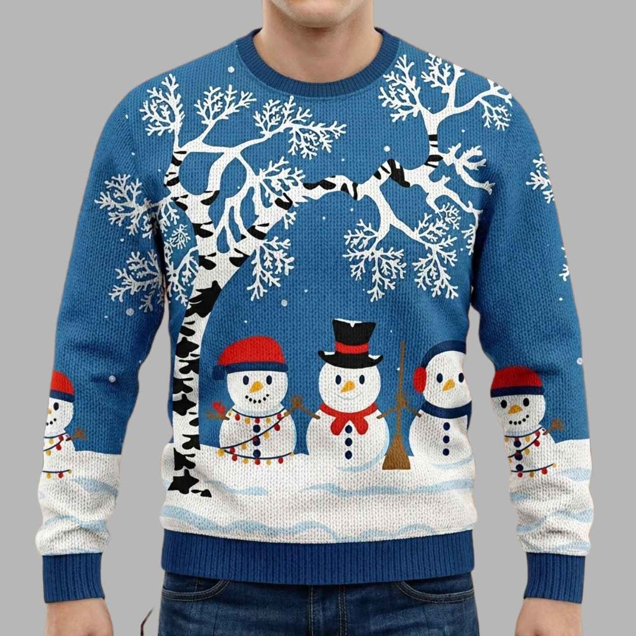 This bright blue sweater features a stunning, detailed image of a snow-covered landscape under a light snowfall. Dominating the upper section is a striking birch tree with white, snow-dusted branches reaching across the sky. Lined up below are a charming row of snowmen, each with a slightly unique character: some wearing Santa hats, one sporting a top hat and scarf, and others wrapped in colorful Christmas lights. The overall design evokes the nostalgic feeling of building snowmen on a crisp winter day. This garment celebrates the simple, timeless joys of the holiday season, embodying warmth, friendship, and the pure, innocent fun of winter activities. It transforms a simple sweater into a wearable, heartwarming piece of seasonal art.