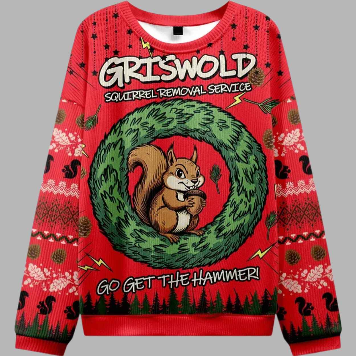 This vibrant, rich red sweater is a must-have for any fan of classic holiday film humor. The design is centered around a lush, detailed wreath within which a bewildered, acorn-clutching squirrel is nestled, a clear reference to the famously destructive family Christmas tale. Above the wreath is the bold text, “GRISWOLD SQUIRREL REMOVAL SERVICE,” and below, the iconic, exasperated command: “GO GET THE HAMMER!” The background and sleeves are adorned with festive patterns featuring pine cones, snowflakes, and squirrels being struck by lightning bolts—a humorous nod to the sheer electrical mayhem of the story. This sweater is more than just a funny graphic; it’s an insider’s appreciation for the relatable chaos that often underlies holiday perfection. It signifies a shared cultural experience and the understanding that sometimes, the best holiday memories are the ones that went hilariously wrong. Wearing this piece is a way to instantly connect with fellow fans, turning your outfit into a collective celebration of dysfunctional family fun and over-the-top festive dedication. It perfectly captures the spirit of enduring the holidays with a wry smile and a sense of humor.