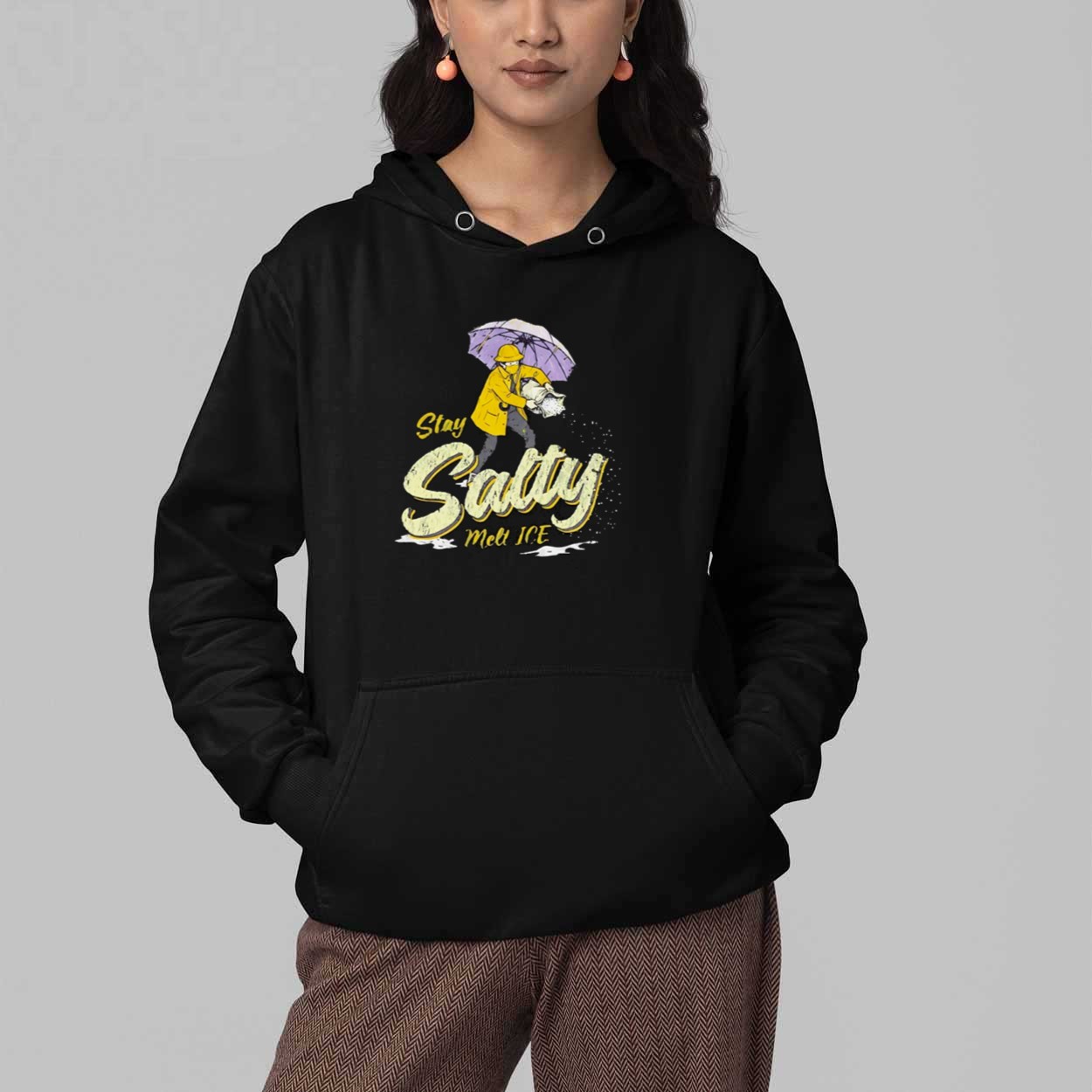 This shirt features a creative and vintage-inspired graphic of a figure in a yellow raincoat spread salt under a purple umbrella, artfully symbolizing resilience and the power of individual action. The “Stay Salty Melt Ice” slogan combines a playful attitude with a deep message of advocacy and social awareness. It serves as a wearable conversation starter, representing a commitment to standing firm in one’s values while promoting a message of warmth, community, and positive change in a world that can often feel cold.