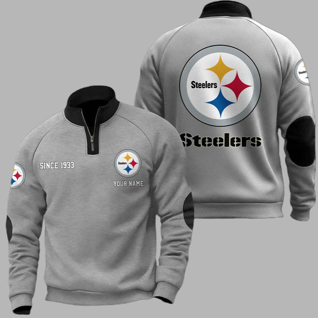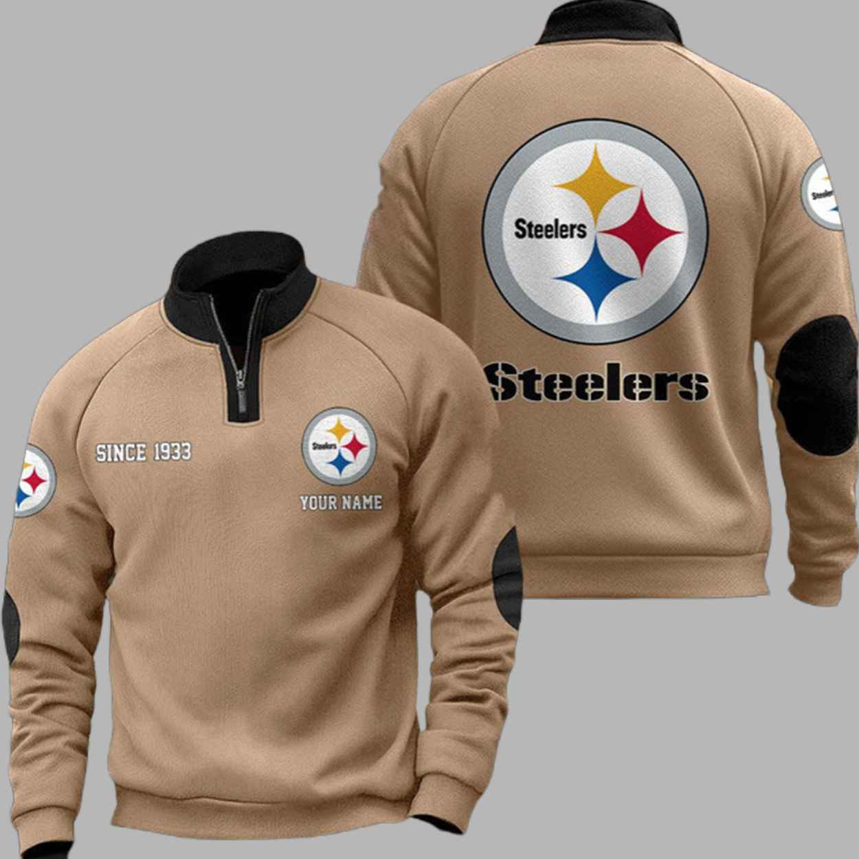This premium black sweatshirt features a structured quarter-zip collar and reinforced elbow patches in a vibrant orange that creates a sharp, high-contrast look. The chest is detailed with the historic “SINCE 1933” founding year alongside the iconic hypocycloid logo, while the back displays a massive team emblem and bold “Steelers” typography. Beyond its striking appearance, this garment serves as a wearable tribute to the grit and deep-rooted traditions of the Pittsburgh community. Every detail, from the clean silhouette to the personalized “YOUR NAME” feature, represents a unique connection to a heritage of strength that has unified dedicated supporters for generations.