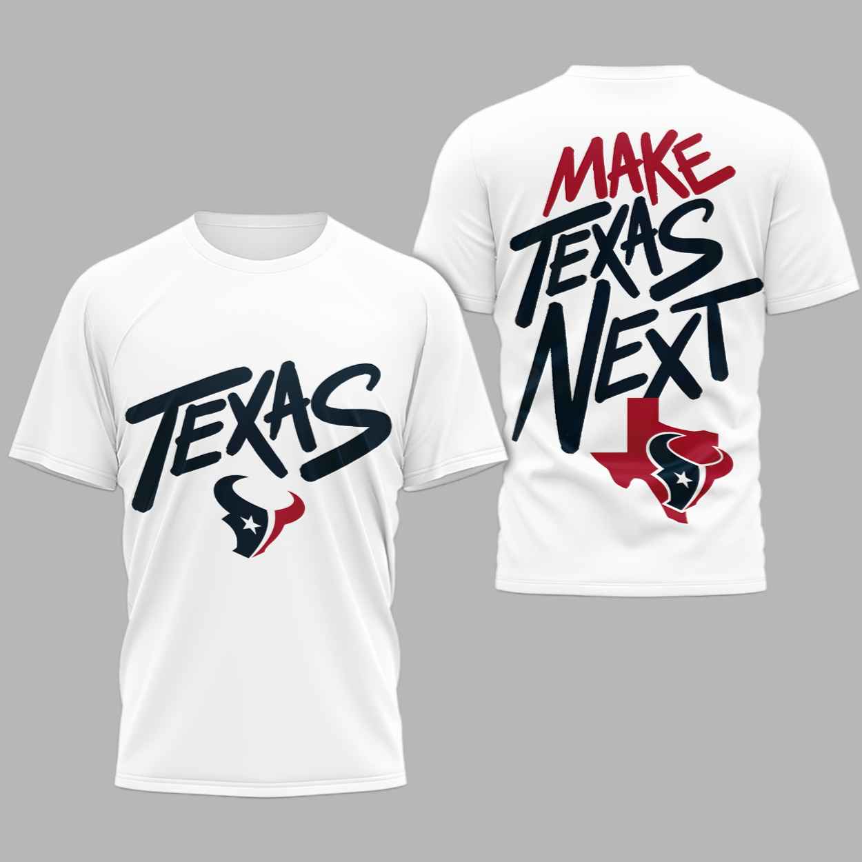 Showcase your unwavering loyalty and the unstoppable momentum of your team with the modern Texans Make Texas Next 3D Shirt.