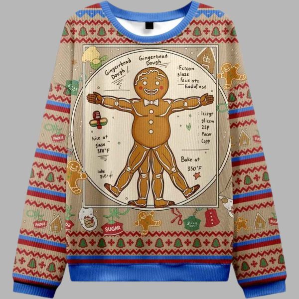 The “The Gingerbread Man Christmas Ugly Sweater” is a cozy, clever pullover that flawlessly fuses traditional holiday knitwear with high-brow artistic parody. The sweater features a warm, inviting beige background, framed by traditional “ugly sweater” Fair Isle patterns of gingerbread men, Christmas trees, and geometric designs in festive red, blue, and white. The centerpiece delivers the ultimate intellectual and humorous punchline: a parody of Leonardo da Vinci’s Vitruvian Man, where the perfectly proportioned human is replaced by a cheerful gingerbread man with multiple arms and legs, perfectly inscribed within a square and a circle. The surrounding text humorously outlines “Gingerbread Dough” instructions and baking temperatures, rendered in a charmingly hand-drawn, scientific style. This design is a masterstroke of clever comedy, transforming the solemnity of Renaissance art and anatomical study into a delightful, edible study of the perfectly baked cookie. It subverts the traditional holiday theme with a blast of delightful, unexpected charm, symbolizing the wearer’s appreciation for puns, art history, and the fun of self-aware parody. It’s a warm, comfortable, and immediately eye-catching piece that is perfect for the baker, the artist, the teacher, or anyone who appreciates a great, highly specific, and self-aware joke about the perfection of baking.