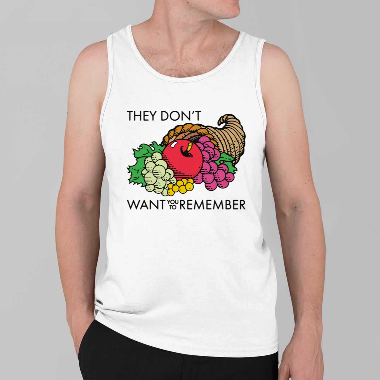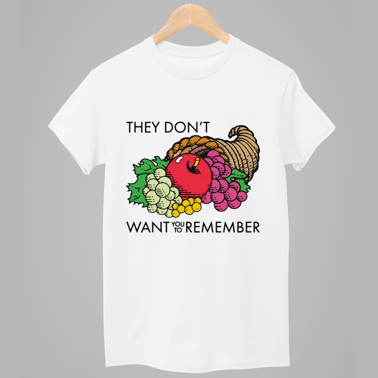 This white shirt features a simple, bold graphic that plays on a well-known cultural inside joke. The design is dominated by an instantly recognizable, brightly colored illustration of a cornucopia overflowing with various fruits, including grapes, an apple, and colorful berries. This particular arrangement and style is a familiar image from decades of product branding. Above and below the colorful graphic, the punchline is delivered in a clean, serious font: “THEY DON’T WANT YOU TO REMEMBER” with the small word “YOU” placed cleverly at the visual break. The humor of the shirt lies entirely in the combination of the iconic, beloved image and the conspiratorial text, suggesting that the memory of this specific visual is somehow a closely guarded secret. This garment is far more than just a piece of clothing; it embodies the shared humor, nostalgia, and collective memory of a generation. Wearing it is an instant signal that you are in on the joke, celebrating a classic piece of visual culture and the power of memory.