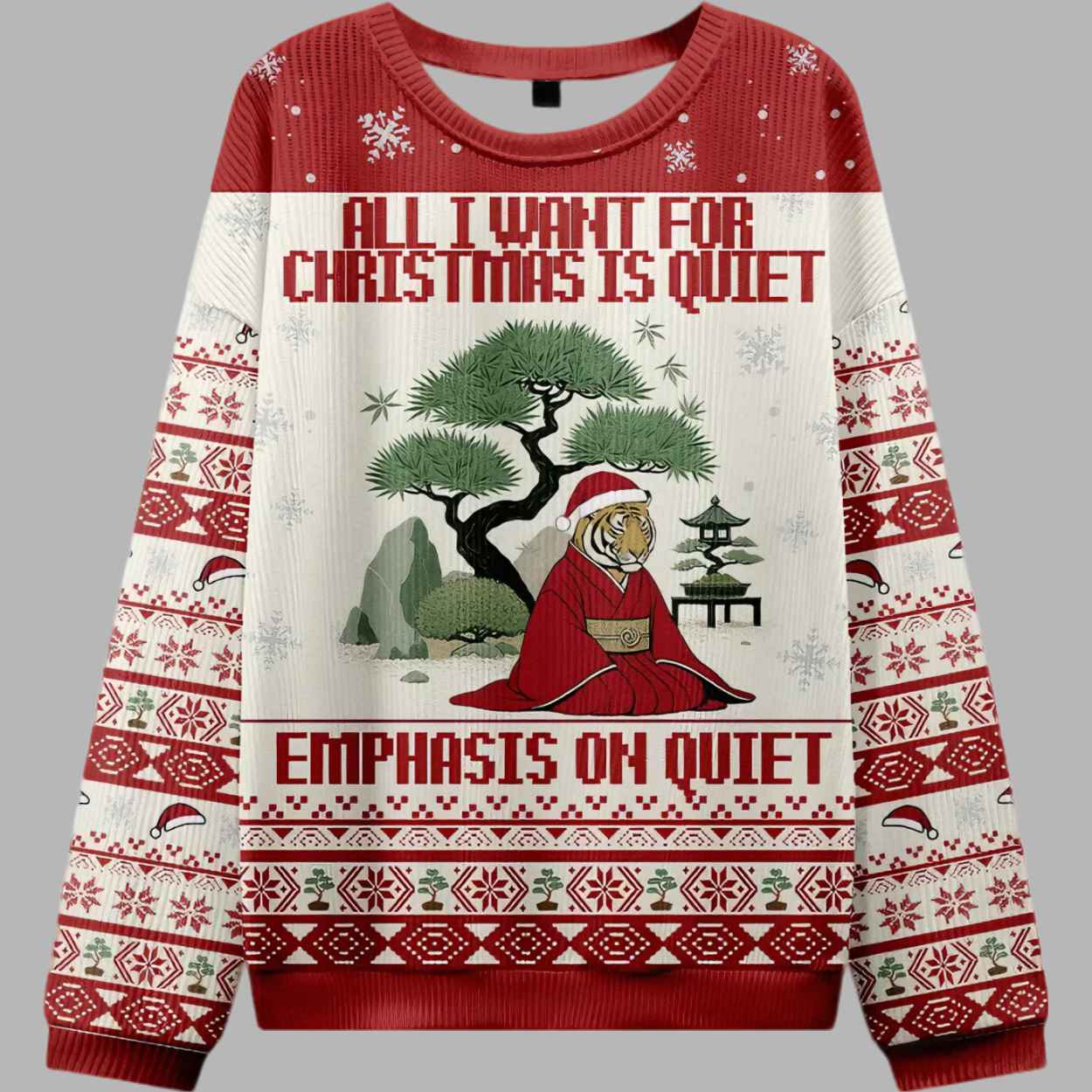 This cozy, crew-neck sweater uses a traditional color palette of red and white, immediately evoking a classic festive feel, beautifully contrasted with subtle green and brown accents. The sleeves and borders feature dense, traditional ugly sweater Fair Isle patterns, including repeating rows of snowflakes, geometric designs, mistletoe, and tiny Santa hats, creating a warm, cozy, and culturally rich frame. The central graphic is a masterpiece of serenity and style: a magnificent tiger is seated peacefully in a meditative pose, dressed in a traditional red kimono and a festive Santa hat. The tiger is positioned in a tranquil Japanese Zen garden, complete with a perfectly pruned bonsai tree, a stone lantern, and a pagoda-style structure, all set against a backdrop of gently falling snow. Above the tiger are the words: “ALL I WANT FOR CHRISTMAS IS QUIET” and below the figure is the punchline: “EMPHASIS ON QUIET.” The image perfectly captures the spirit of quiet contemplation, contrasting the tiger’s wild nature with its profound desire for holiday calm.