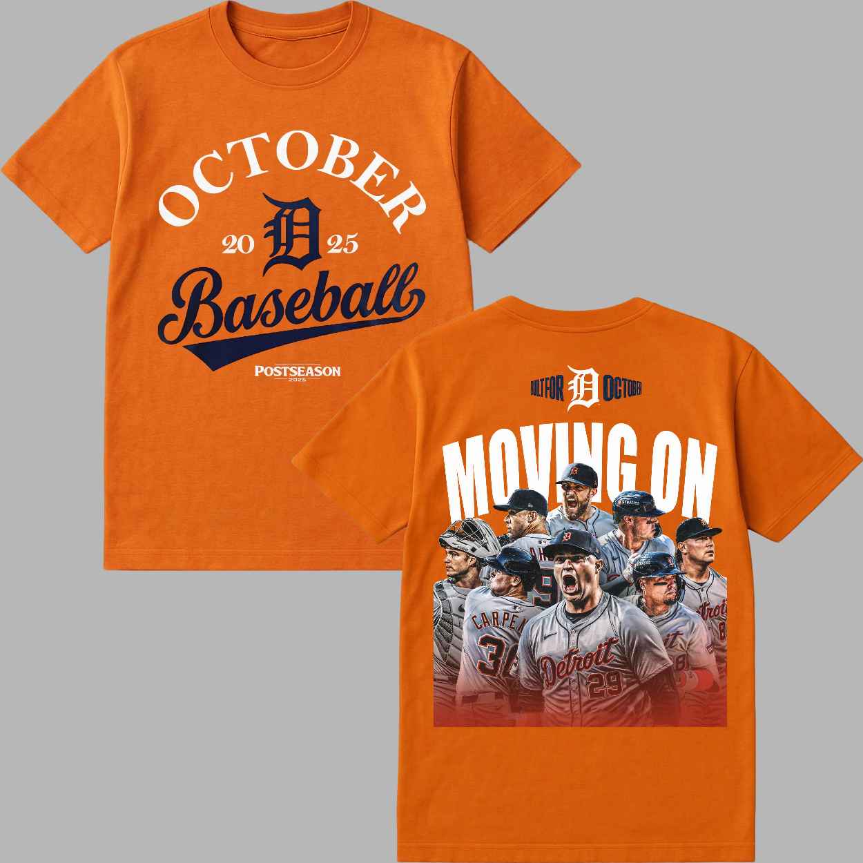 This exclusive Tigers October 2025 Baseball Shirt is a high-quality, full-print item crafted for both comfort and a striking visual impact. The shirt features the classic Tigers orange color, making the vibrant white graphics truly stand out. The front proudly displays the text “OCTOBER Baseball” in a bold, stylized font, with the year “2025” positioned around the iconic Tigers logo. The back of the shirt features a fierce collage of Tigers players in action, celebrating the intensity of the game. Above the players, the triumphant text “MOVING ON” is boldly printed, making a clear and audacious declaration of a playoff series win. This shirt serves as a pre-emptive commemorative item, celebrating the fan base’s belief that the team is ready for the 2025 MLB playoffs and will conquer the first round to keep their championship dreams alive.