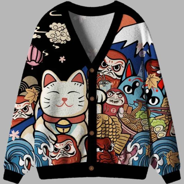 The “Traditional Japanese Elements Ugly Cardigan Sweater” is a spectacular visual tapestry that blends iconic cultural symbols into a wearable celebration of maximalism. The black backdrop and bold black trim frame an incredible, busy scene dominated by a cheerful, oversized Maneki-Neko (Beckoning Cat) sitting among a crowd of fierce Daruma dolls, stylized Hannya masks, delicious ramen bowls, and the unmistakable peak of Mount Fuji. Rendered in a lively, graphic style with rich blues, reds, and golds, the design is a delightful sensory overload. Far from being truly “ugly,” this sweater is a brilliant example of artistic kitsch, symbolizing a fusion of good fortune (Maneki-Neko, Daruma) and the vibrant, complex spirit of Japanese culture. It’s an eye-catching garment that carries a powerful message of luck, prosperity, and playful cultural appreciation. The cardigan’s casual silhouette and button-front closure make it an easy, comfortable way to showcase your love for global art and your bold approach to festive dressing.