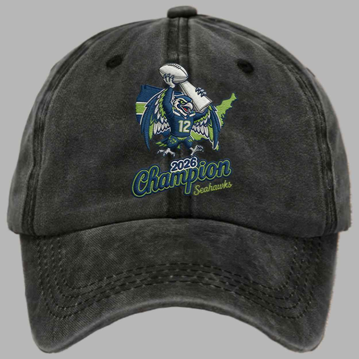 This headwear features a vintage-inspired charcoal aesthetic that serves as a timeless backdrop for a vibrant victory graphic. The design is anchored by an elite hawk mascot holding the world championship trophy aloft over a map of the United States, representing the franchise’s dominance across the entire country. With the bold “2026 Champion” headline and the iconic “12” mark prominently displayed, this piece serves as a wearable archive of the squad’s triumphant journey to the summit of the sport, capturing the relentless drive and unity of a roster that has once again reclaimed its throne.
