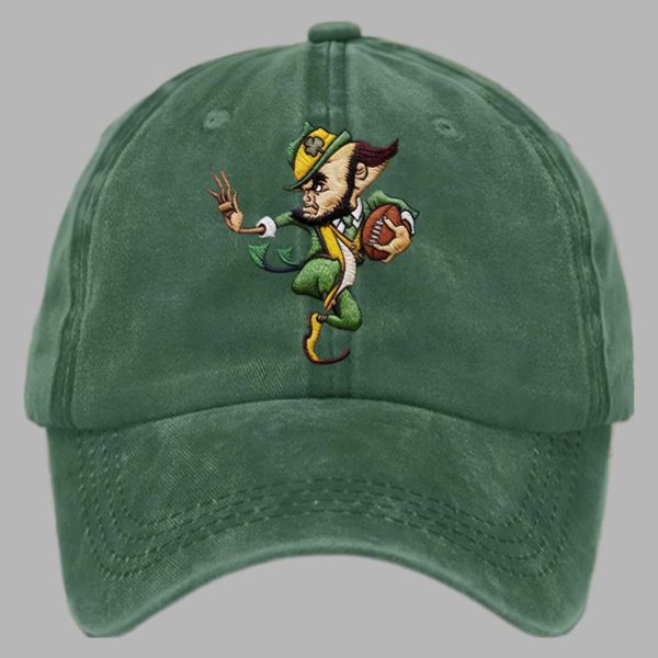 This traditional baseball cap comes in a deep, washed-out green that gives it an immediate vintage appeal. The centerpiece of the cap is a detailed, embroidered graphic of the iconic leprechaun mascot, posed dynamically with a football in hand and ready for action. The fierce expression and traditional green and gold attire of the figure capture the enduring fighting spirit of the team. The cap features an adjustable back strap, ensuring a comfortable fit for all. This garment transcends standard team wear by symbolizing not just fandom, but a deep connection to the rich history and cultural legacy of the team. It embodies a sense of spirited tradition and passionate loyalty, making it a powerful, wearable piece of sports heritage.