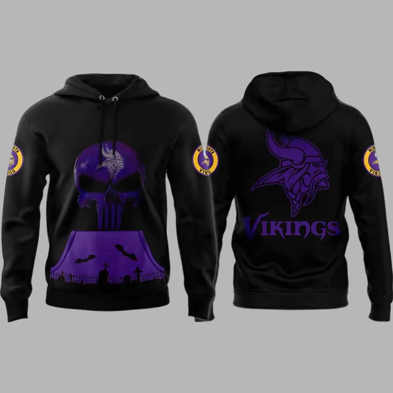 The back features the team’s recognizable Viking helmet logo and wordmark in bold purple, creating a powerful, clean statement of primary loyalty. This design’s meaning lies in its celebration of competitive ferocity and intimidating presence. The skull and dark aesthetic symbolize the team’s historic, relentless spirit and the fear they instill in their rivals. Wearing this hoodie is a confident, bold way to signal that your team is a relentless force, ready to dominate the competition and the season. The hoodie is designed with a comfortable, classic fit and a drawstring hood, perfect for staying warm while you haunt the stadium.