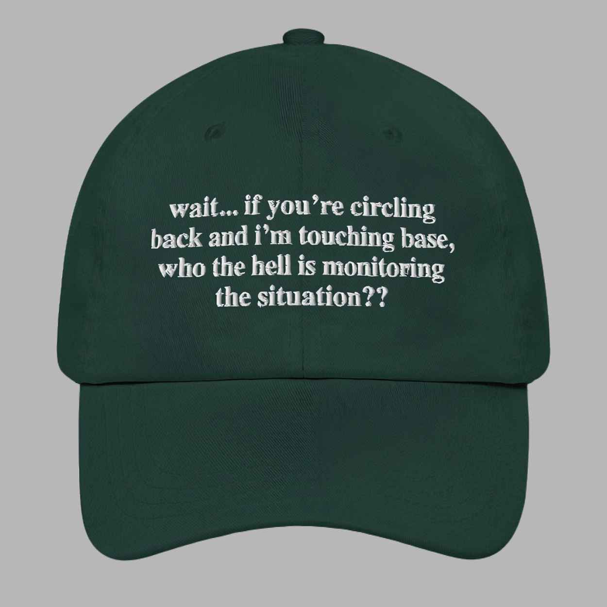This classic red baseball hat features a witty, embroidered text graphic on the front. The words “wait… if you’re circling back and i’m touching base, who the hell is monitoring the situation??” are stitched in a simple white font. The design is clean, minimalist, and lets the humorous message speak for itself. The curved brim and comfortable, unstructured design give the hat a classic, casual feel.
