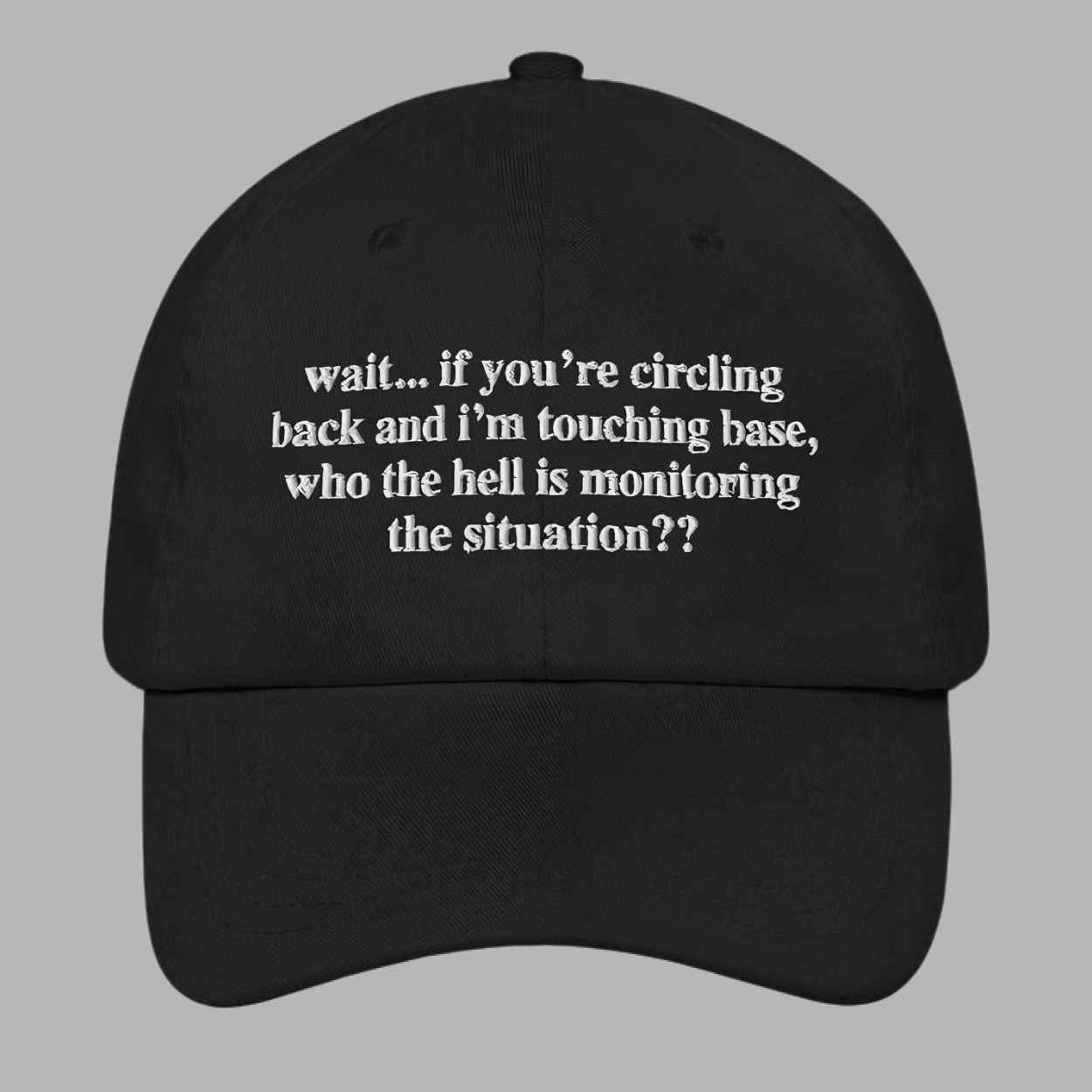 The Wait If You’re Circling Back And I’m Touching Base Who The Hell Is Monitoring The Situation Hat is the perfect blend of style, comfort, and professional humor. With its eye-catching design, high-quality materials, and hilarious message, it’s a must-have piece of gear for anyone who wants to make a bold statement. Get yours today and wear it with a knowing smile, celebrating the corporate world in style!