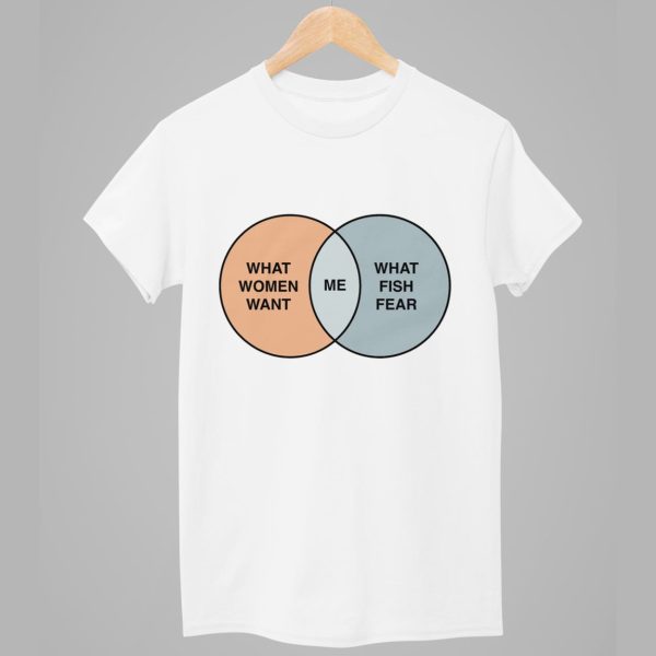 This white shirt features a minimalist yet profoundly funny design that uses the universally understood format of a Venn Diagram. The graphic consists of two overlapping circles. The circle on the left, colored a soft peach or salmon, is labeled “WHAT WOMEN WANT.” The circle on the right, colored a cool blue-gray, is labeled “WHAT FISH FEAR.” The center, overlapping space—the intersection of both sets—is labeled simply “ME.” This clean, high-concept design delivers its punchline with intellectual wit and perfect visual irony. This garment is far more than just a piece of clothing; it is a piece of wearable conceptual humor. It embodies a wearer who is confident, self-aware, and possesses a sharp, slightly sarcastic sense of humor. It symbolizes the ability to connect two disparate concepts (attractiveness and fishing prowess) into a single, hilarious declaration of one’s unique desirability and dominance. It’s an instant conversation starter that appeals to thinkers, comedians, and outdoor enthusiasts alike.