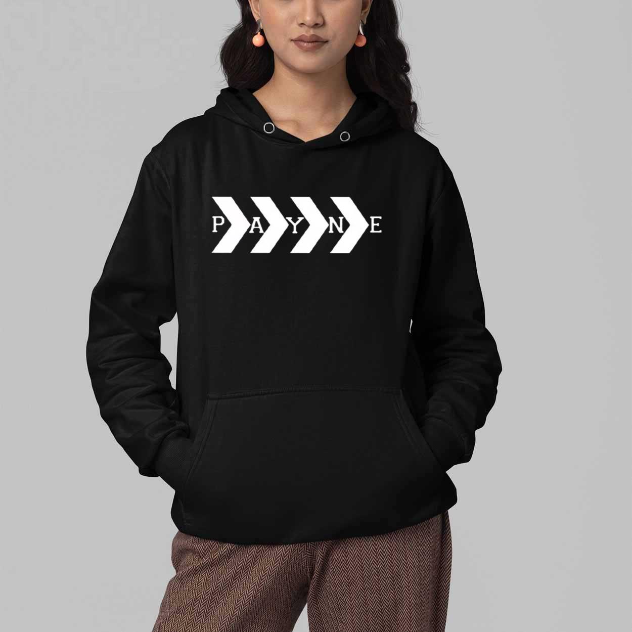 This trendy shirt features a minimalist yet eye-catching design inspired by Liam Payne’s signature arrow logo. The bold white arrows and “PAYNE” inscription are set against a classic black background, creating a sleek and modern look.