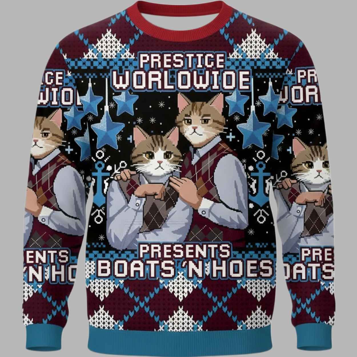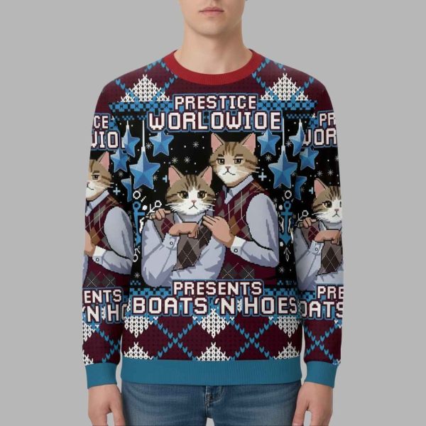 This bold sweater features a deep burgundy and black base with a dense argyle pattern and sharp, stylized geometric borders in light blue and white, reminiscent of a retro knit. The central design is a repeated motif of two impeccably dressed cats in human clothing, sporting vests, button-down shirts, and argyle sweaters, looking serious and professional. The text, strategically placed around the cats and stars, proclaims the hilarious and memorable lines: “PRESTIGE WORLDWIDE PRESENTS BOATS ‘N HOES.” The design brilliantly merges the cozy, busy aesthetic of an ugly Christmas sweater with a highly specific, beloved cinematic quote. This garment transcends typical novelty wear by symbolizing the fun of sharing niche humor and celebrating iconic, over-the-top confidence. It transforms a simple sweater into an instant badge of pop culture recognition and a hilarious statement about ambition and holiday decadence.