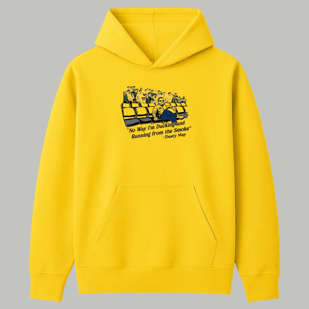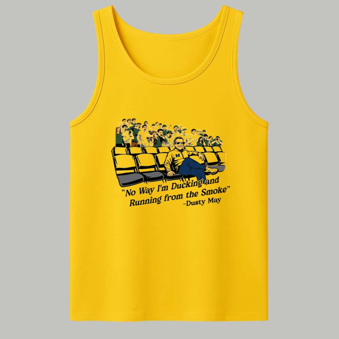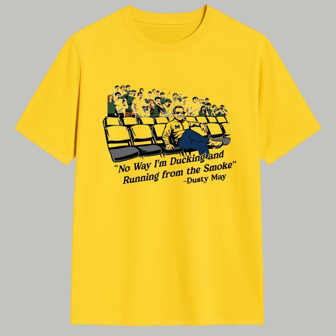 The Yaxel Lendeborg Dusty May No Way I’m Ducking And Running From The Smoke Shirt captures a powerful moment of coaching philosophy and player determination. Featuring a detailed graphic of Coach Dusty May confidently seated in front of a passionate crowd, paired with his iconic quote about facing challenges head-on, this design symbolizes the unwavering courage required to succeed at the highest level. It is more than just a piece of apparel; it is a tribute to the “no-quit” attitude of Yaxel Lendeborg and the strategic brilliance that defines this era of the game, making it a symbolic badge of honor for anyone who admires true competitive fire.